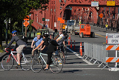 Today was the first major test of a two-month closure of the Broadway Bridge. The bridge is closed due to streetcar track construction until September 3rd, however it remains open to biking and walking traffic. This morning, I heard from streetcar crews on the scene that the south sidewalk will remain open to non-motorized traffic until July 17th. After that, the plan is for the entire bridge to be closed to all vehicles (that means bikes too) for the remainder of the summer.