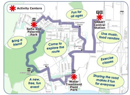 “This free event will focus on connecting neighborhoods, parks, and people: bicyclists, walkers, runners, seniors, adults and children will enjoy traffic-free streets filled with fun and interactive entertainment, music, physical activities, and food.”