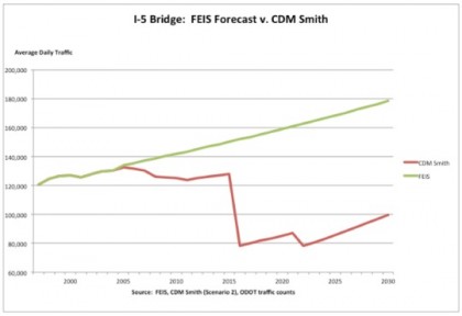 Cortright also points out that the traffic projections by CDM Smith differs greatly from the projections included in the CRC’s Final Environmental Impact Statement (FEIS); so much so that these new numbers “invalidate” the “dramatically wrong” FEIS numbers (as seen in the chart below)…