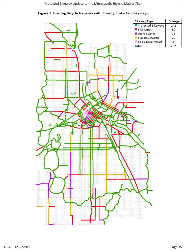 Protected bike lanes: Minneapolis is circulating a draft plan to build 30 miles of them by 2020, largely by upgrading existing bike lanes.