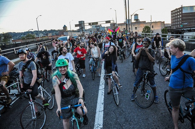 And the crowd was very solid. Probably a few hundred people – enough to easily fill up the entire roadway for a block or two. We rode on Naito then up the ramp to the Morrison Bridge and onto SE Belmont. I peeled away and headed home at that point but the group rode over to Hawthorne and then ended up on the Waterfront for a post-ride chill session.