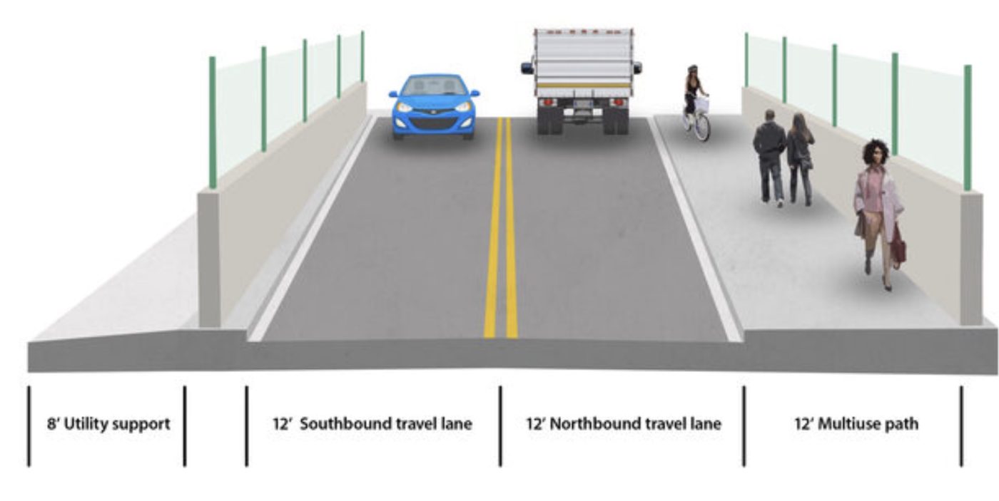 The planned cross-section for the new bridge includes a two-way protected bike lane at sidewalk level on the east side and 8-foot sidewalks on both sides.