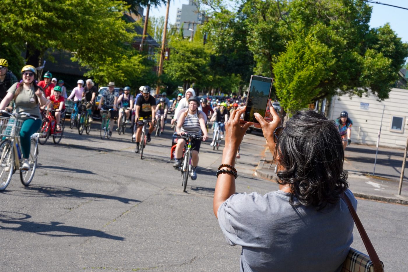 To be clear, the fundamental difference is that those street takeovers are inherently dangerous and their participants are using large, steel vehicles with powerful motors that can easily — and often do — hurt and killed people. In the 23 years of Pedalpalooza rides, I’m not aware of anyone’s bicycle inflicting that kind of harm on another person. And of course there’s the environmental impacts, which are really terrible with takeovers, but are actually beneficial with bike rides.
