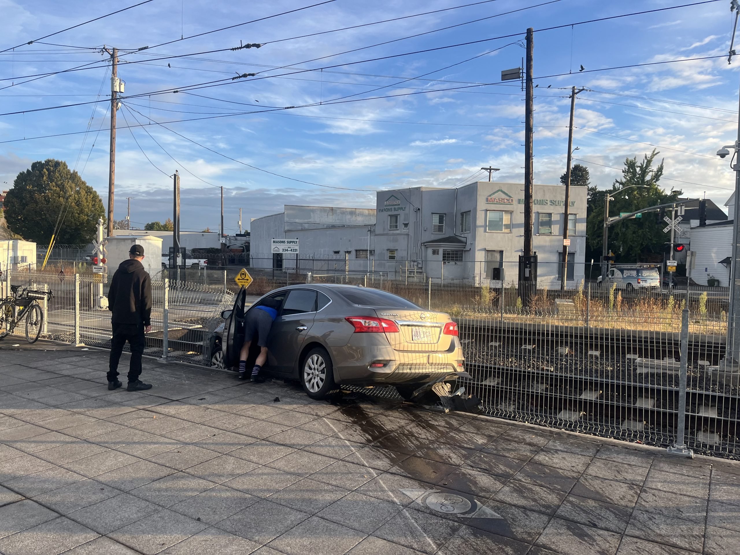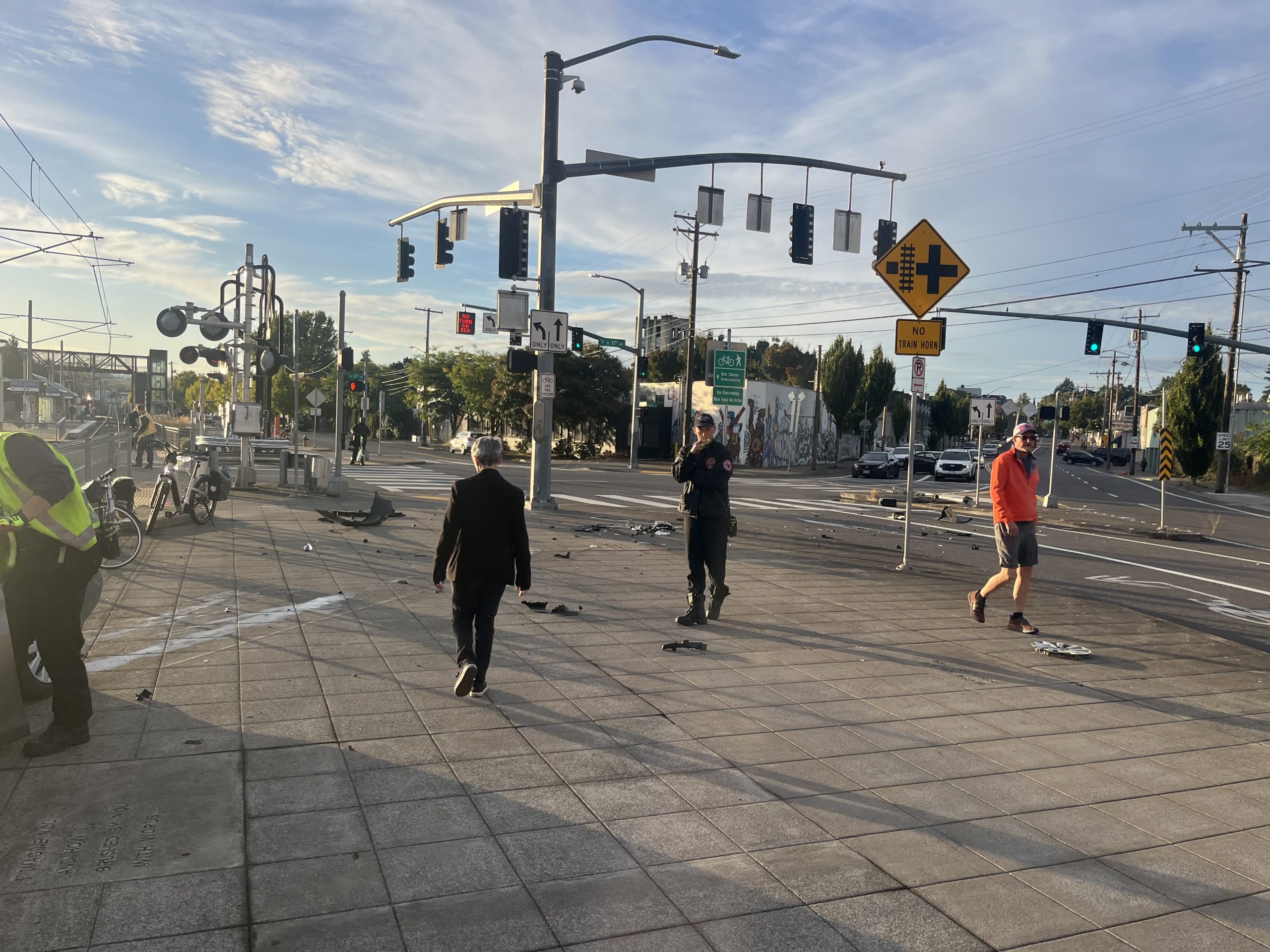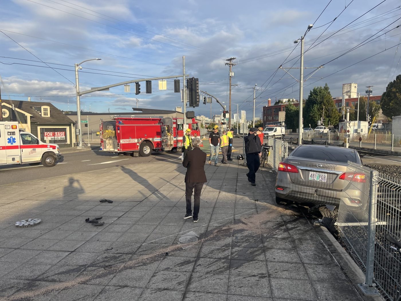 “A driver traveling northbound on Milwaukie Ave at high speed lost control near the Clinton/Gideon rail tracks intersection. He struck and knocked down a metal traffic light pole, then careened onto the curb, through fencing, and onto the MAX tracks.