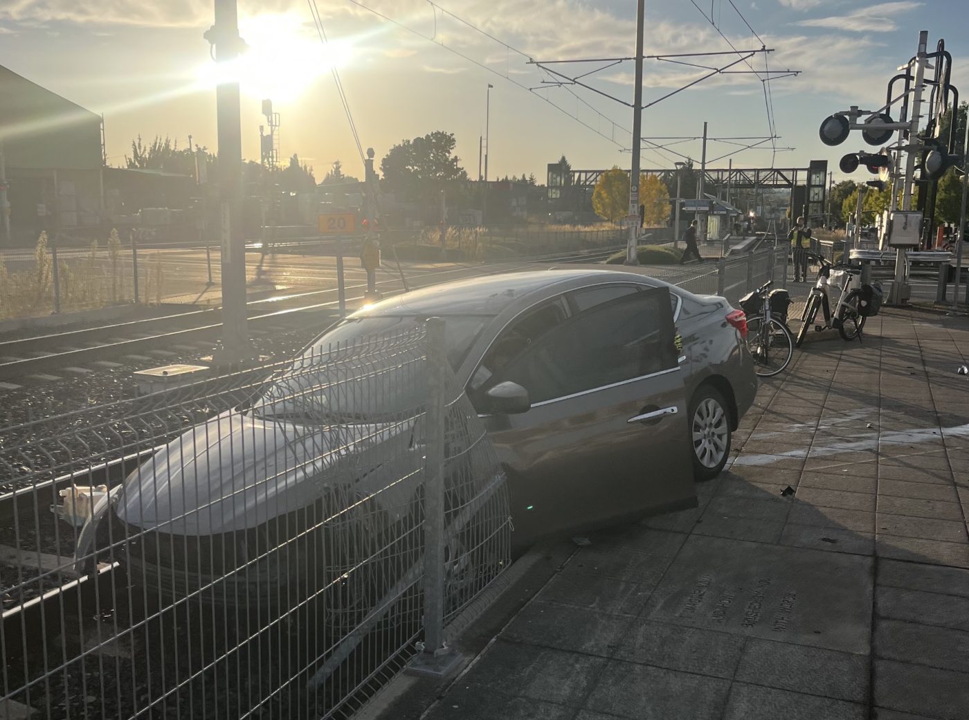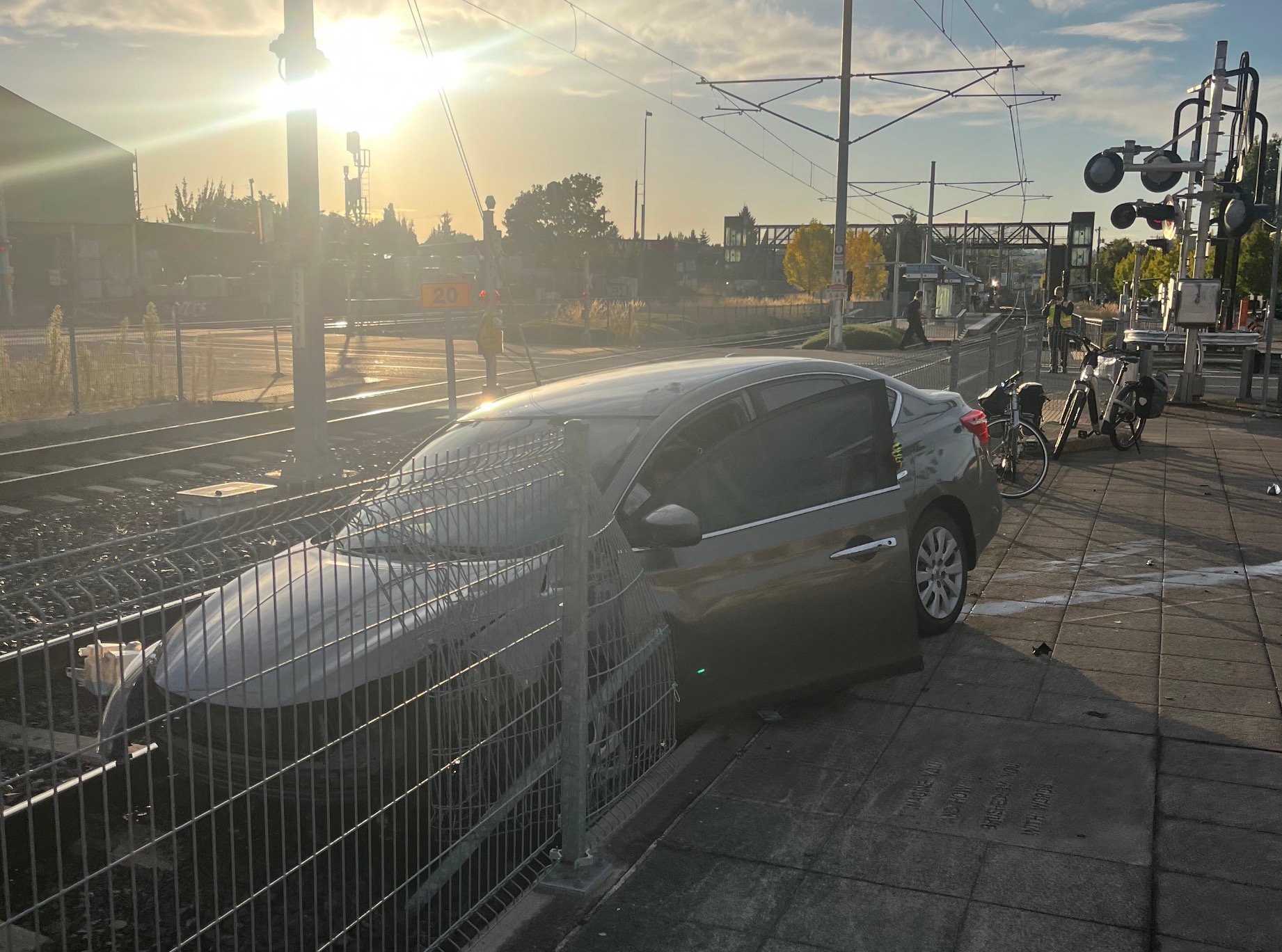 Because the driver now was on the tracks with a MAX train heading Eastward (other bikers were able to flag the train to stop thankfully) — and after ensuring area was safe — I was able to speak to the driver to get his permission to help and open door (very tinted windows made it difficult to visually determine safety) and pull him from the car. A young man, very confused and understandably disoriented. The steering wheel and side-curtain airbags all deployed. It’s easy to assume he was intoxicated, however it’s also totally possible he had a medical event (seizure, cardiac episode, etc.). Irrespective of those circumstances, he clearly was driving way too fast. Fire and EMS took a very long time to arrive. 911 repeatedly dropped my calls, and response times felt very slow, which was frustrating.