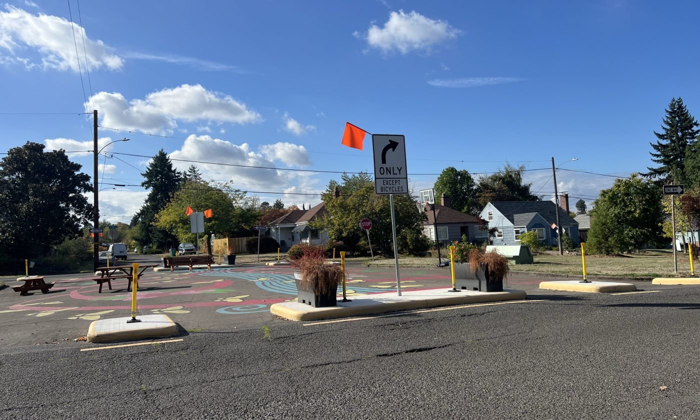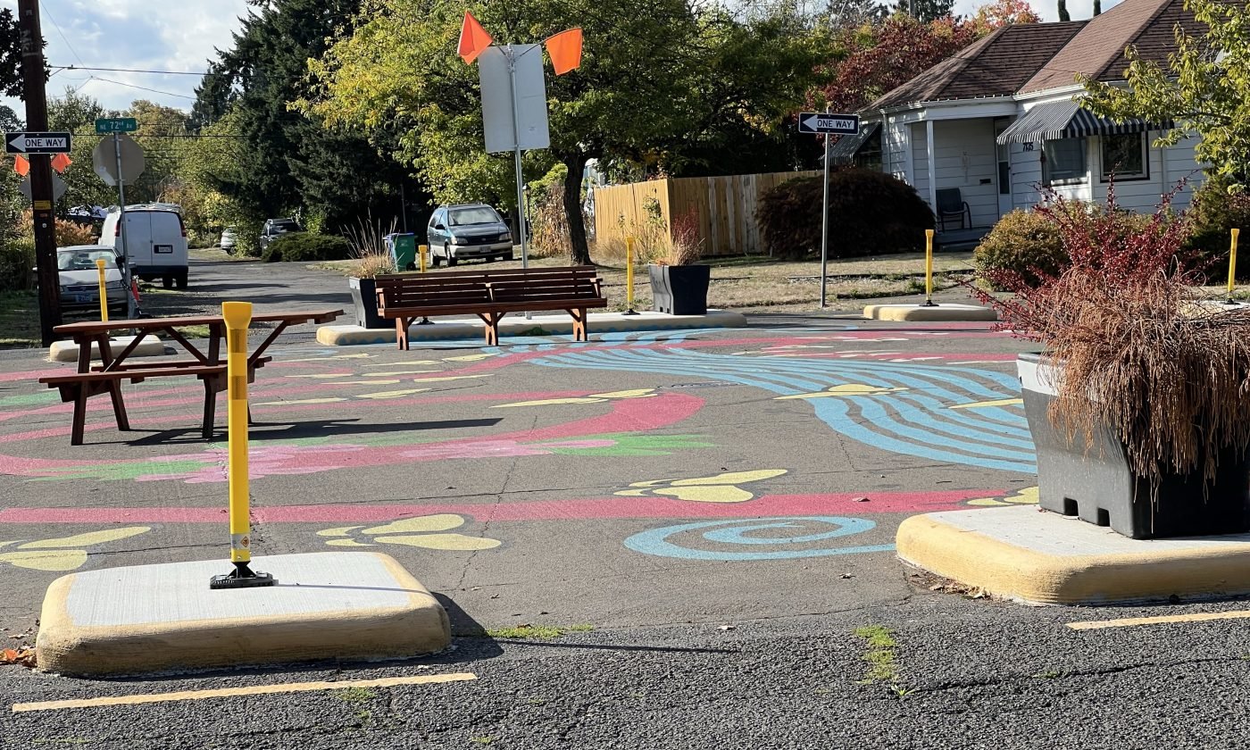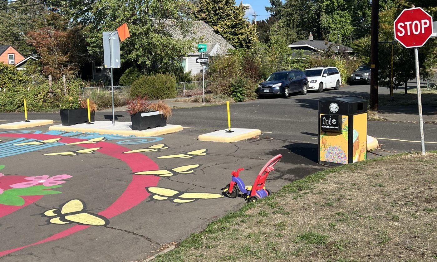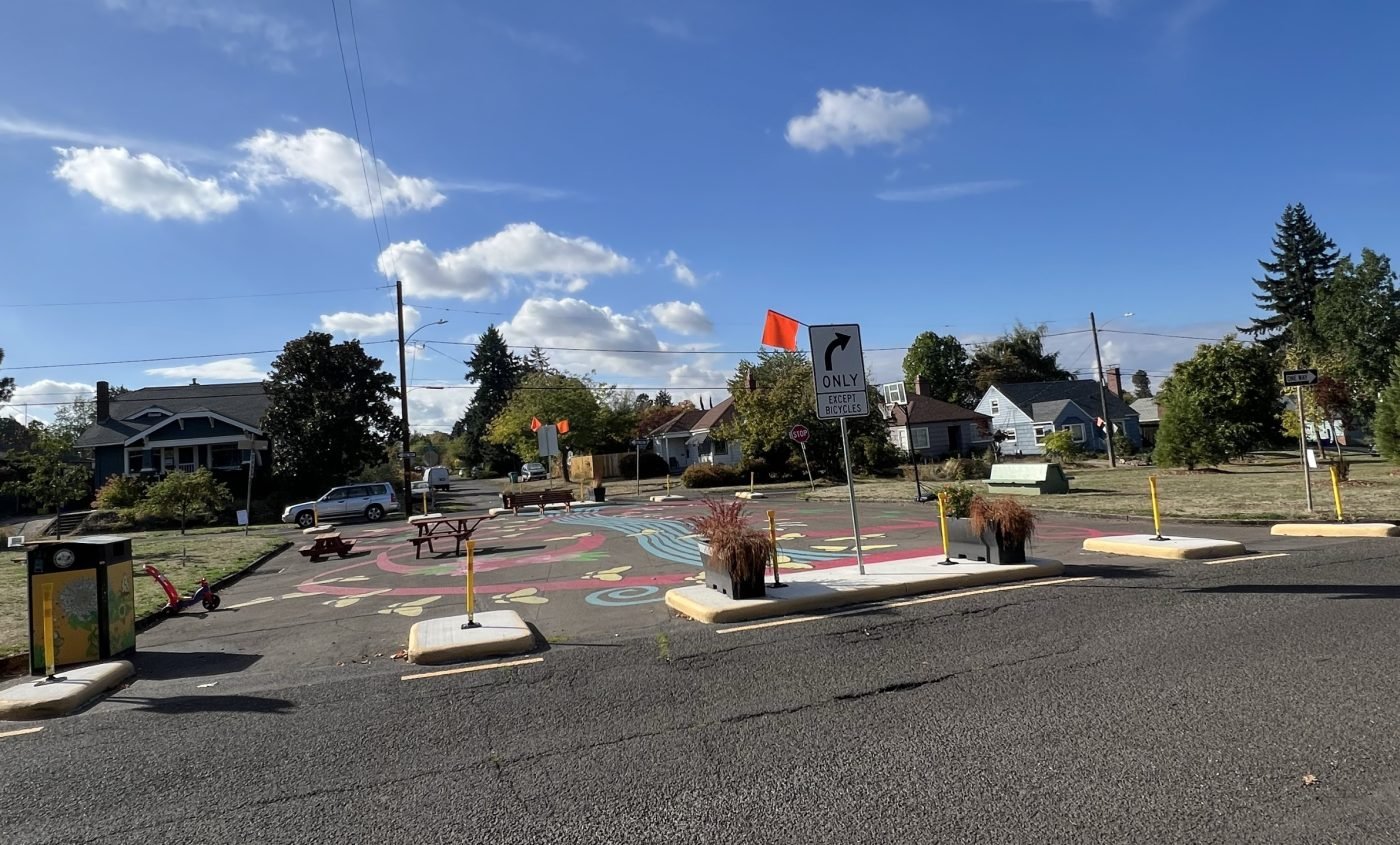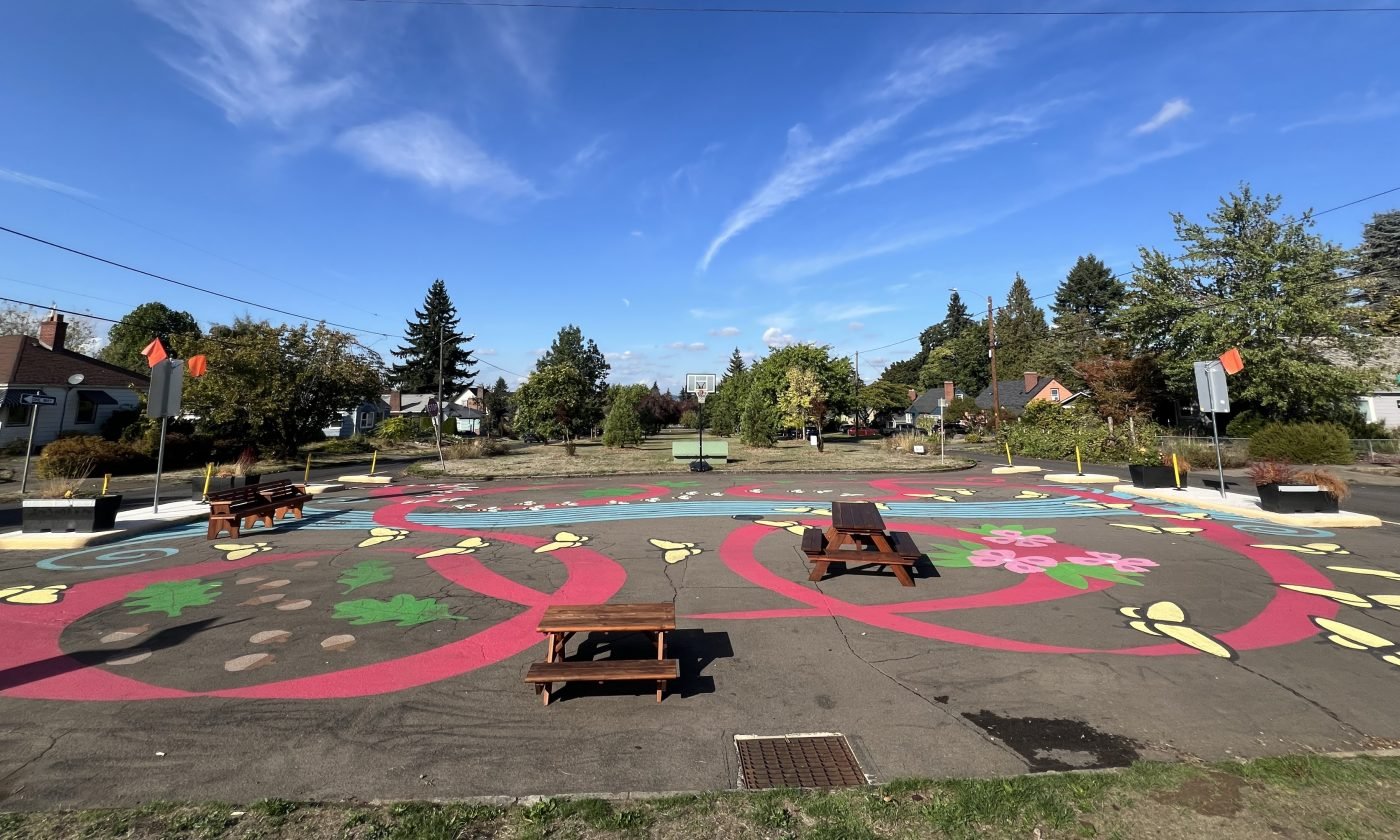 Do yourself a favor and roll or walk over to Northeast 72nd and Mason. What you’ll see is a carfree plaza bordered by a grassy parkway, a vibrant mural on the pavement, a basketball hoop, and places to sit and watch the community unfold around you. Talk of carfree streets often assume they’re only possible in the Central City; but thanks to visionary politicians, neighborhood advocates and supportive city policy, we are finally seeing plazas extend way beyond downtown.