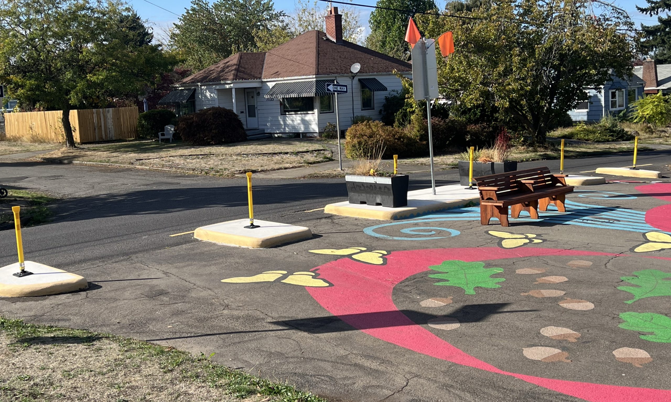 The dream of Roseway Plaza emerged from the Portland Bureau of Transportation’s Mason/Skidmore Neighborhood Greenway project (funded through the Fixing Our Streets program) which runs east-west on those two streets between NE 37th and NE 77th. According to the Roseway Neighborhood Association (RNA), they worked with PBOT for years to make the plaza a reality. “The plaza is a welcoming open space for the community to gather, have fun, and make connections.” the neighborhood’s website reads. “We want to make sure that the space is accessible to those with limited mobility, and inviting to all community members. By activating the intersection and surrounding parkway, we also hope to calm traffic on 72nd Ave.”