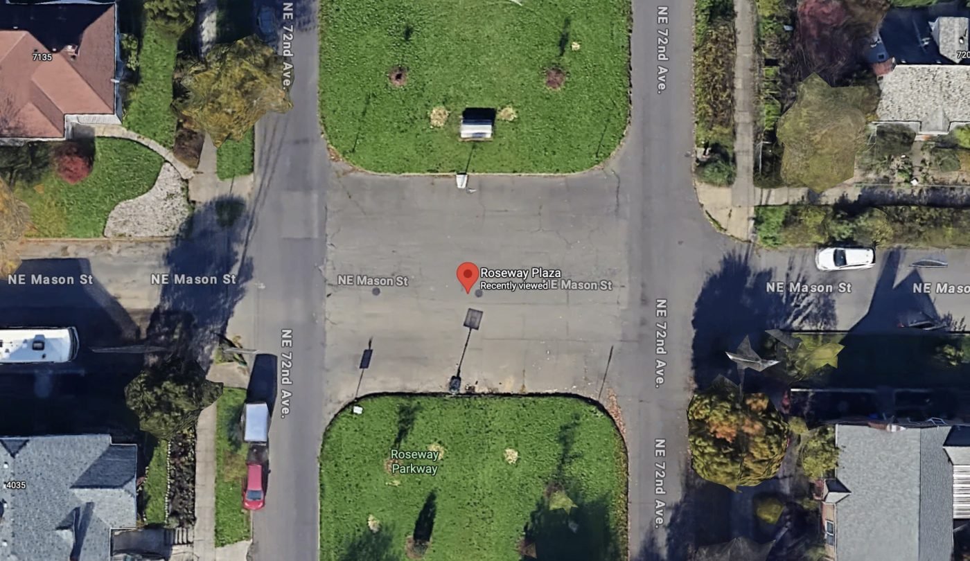 The Roseway Plaza is in the middle of what’s known as Roseway Parkway, a wide park down the middle of 72nd Ave between NE Sandy and Prescott. The layout is nearly identical to what’s known as the Omaha Treeway between N Rosa Parks and Killingsworth in the Arbor Lodge Neighborhood. PBOT is currently in the design stage of a neighborhood greenway project for N Ainsworth that proposes a similar carfree plaza at N Omaha Ave. If you’re interested in that project, there’s a community walk scheduled for this Wednesday (10/8) that will end at the treeway. Meet at Arborlook Carts (5916 N Greeley) around 6:00 pm to join.