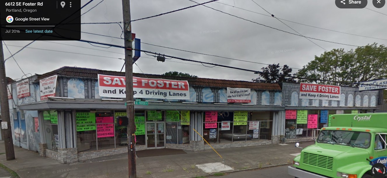 Thank heavens they’ve managed to stay in business for all of these difficult years after the road diet that “strangled”/”gridlocked”/”messed up”/”pinched off”/”effectively close[d] down” Foster. Any of his silly signs would make good(?) talking points for an interview. They changed frequently, and google street view caught a few versions of them.