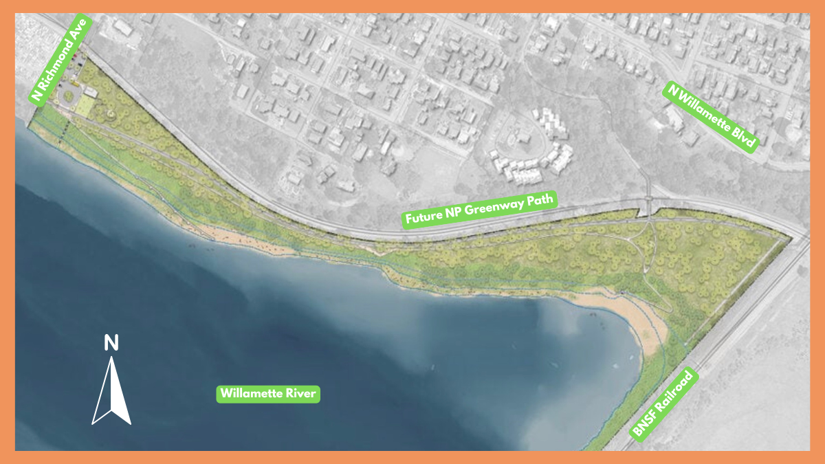 The park is bordered by N Richmond Avenue in the north and a BNSF railroad line (and bridge) to the south. The current plan is to build a parking lot and main entrance off of Richmond Ave. The parking lot would have bike parking too, and folks would be able to access two paths. One of the paths will be the future North Portland Greenway and would be a 12-foot wide paved experience, and the other would be a more park-specific 4-6 foot wide nature trail for a, “more immersive, habitat-focused experience.”