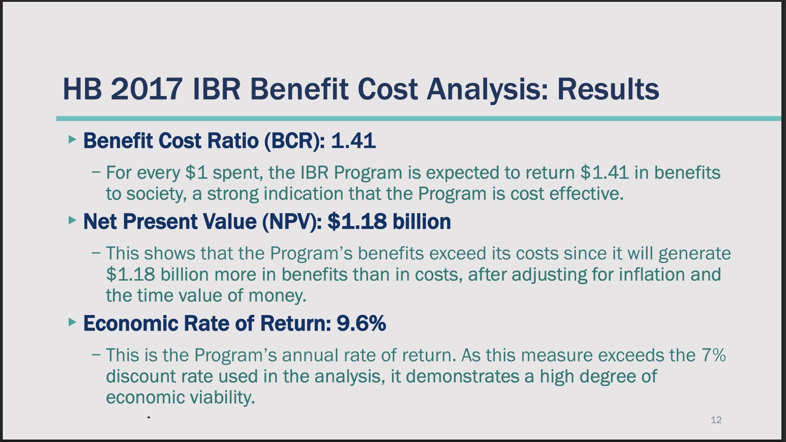 While it was just a procedural step, Commissioner Jeff Baker was not having it. Baker (in photo below), a retired business executive who’s served on the commission since 2023, took issue with a presentation about the funding increase shared by IBR Assistant Program Administrator Ray Mabey. Mabey’s presentation included a slide (see below) that summarized results of the project’s cost benefit analysis. “For every dollar spent, you get a return of $1.41 in benefits,” Mabey said. “So at this current cost estimate, that’s a strong indication that our program is cost-effective.”