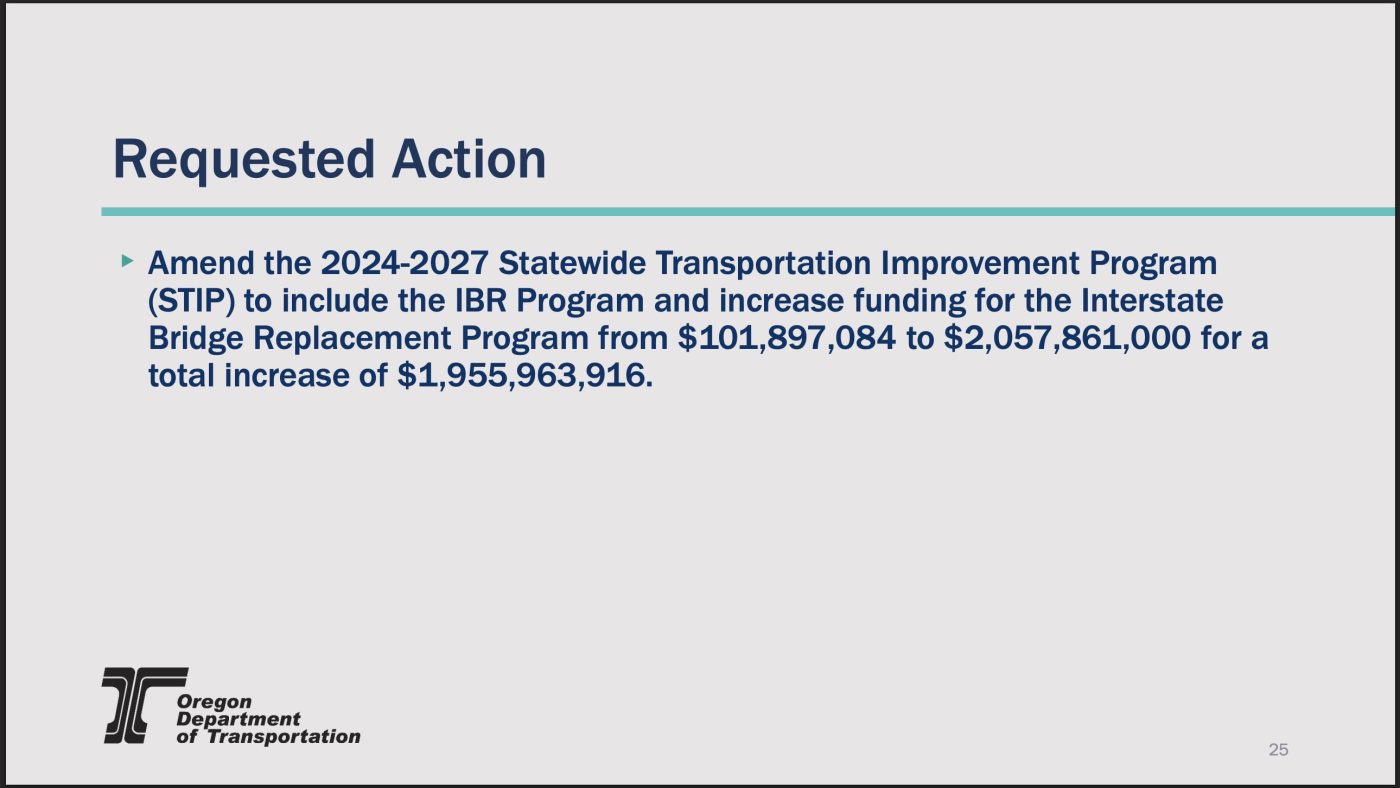 It happened at the OTC meeting Monday where commissioners were asked to approve a request by ODOT to add nearly $2 billion in funding to the Interstate Bridge Replacement Program (IBR). The funding has already been identified from a range of sources (including state general obligation bonds, future toll revenue, a federal grant, and so on) and the OTC was being asked to amend the Statewide Transportation Improvement Program (STIP) to reflect the additional funding.