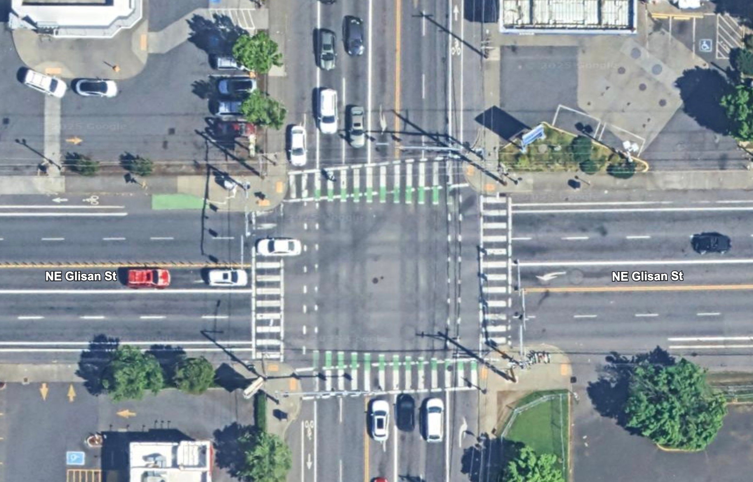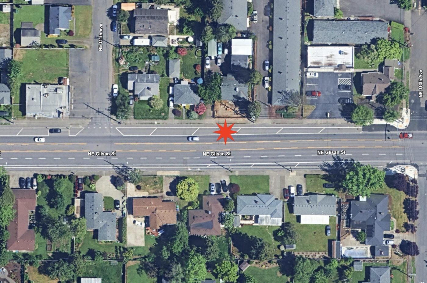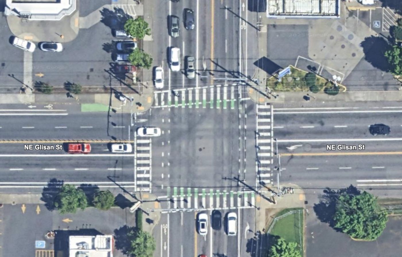 The Portland Bureau of Transportation changed the lane configuration on this street as part of their East Glisan Street Update project in 2022. That project lowered the speed limit (from 35 and 40 mph to 30 mph) removed one of the general travel lanes and added buffered bike lanes in each direction. Unfortunately PBOT did not install any physical protection for bike lane users. One year ago another bicycle rider was killed by a car driver just 0.8 miles east of last night’s fatality (at NE 128th). And in 2021, BikePortland reported on a major hit-and-run collision at NE Glisan and 114th that seriously injured three people.
