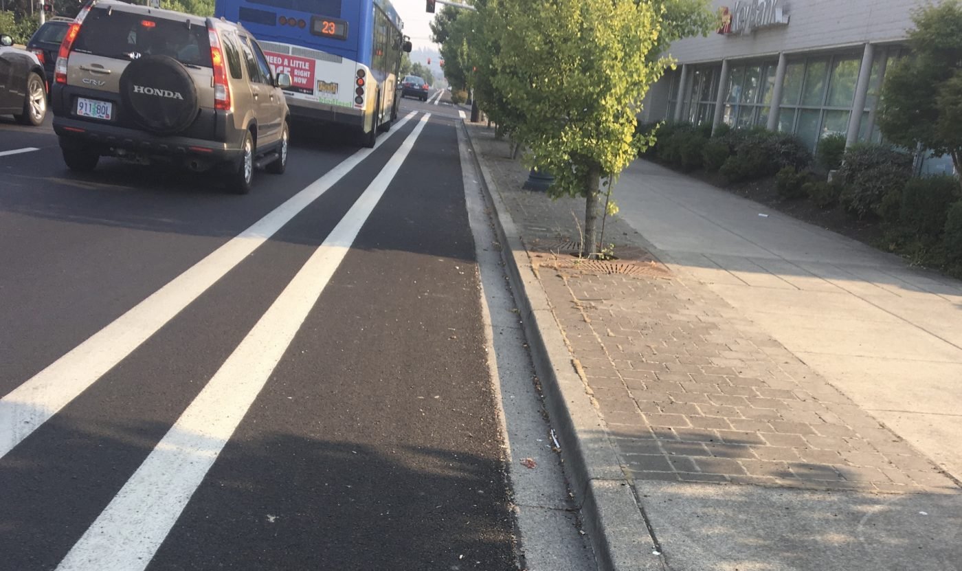 111th/Glisan: “Parking protected” design might be a misnomer. Most of the adjacent blocks are no parking. This is better described as a buffered bike lane, although Portland makes no distinction between the two on its maps.