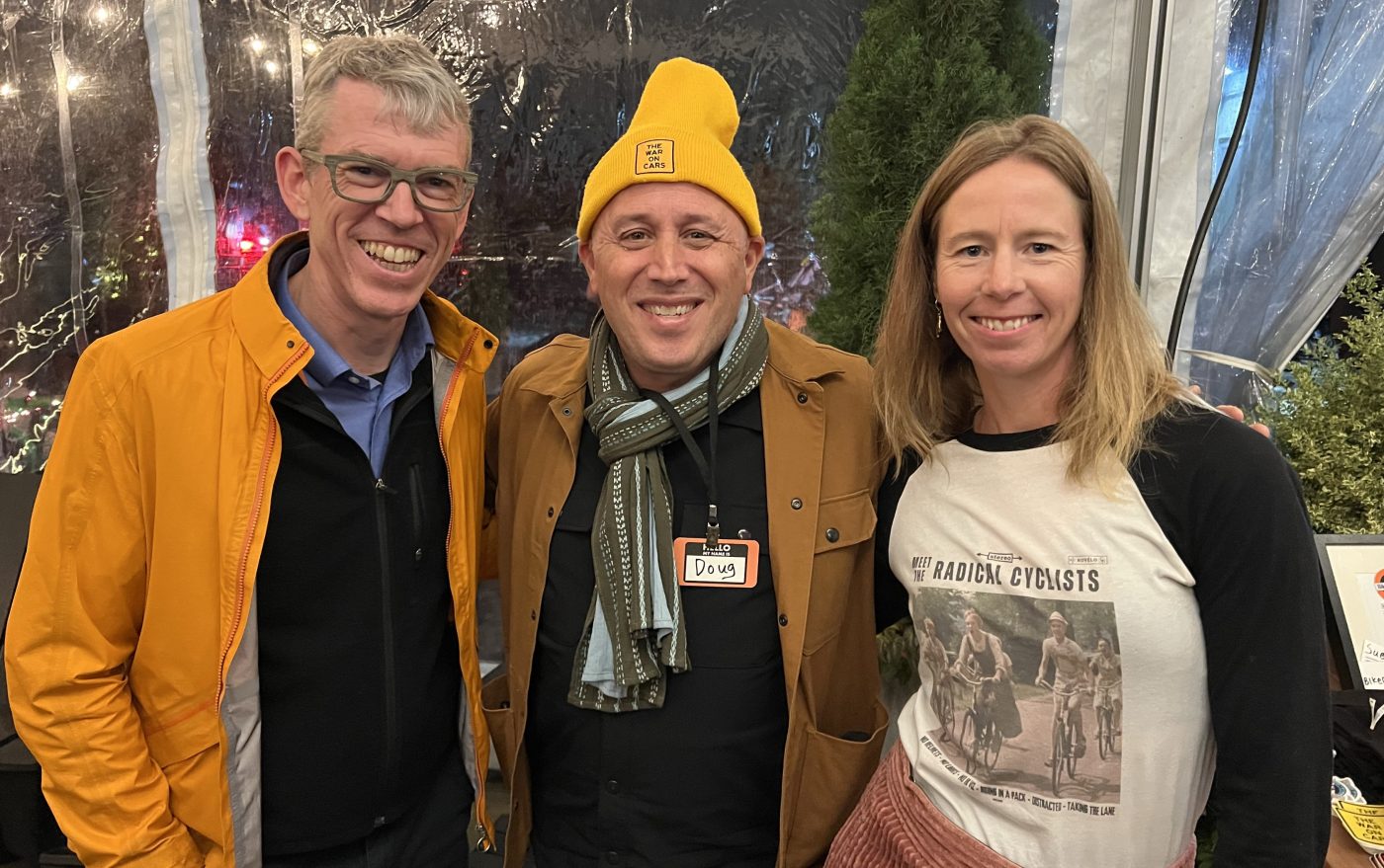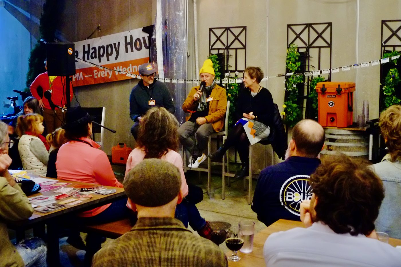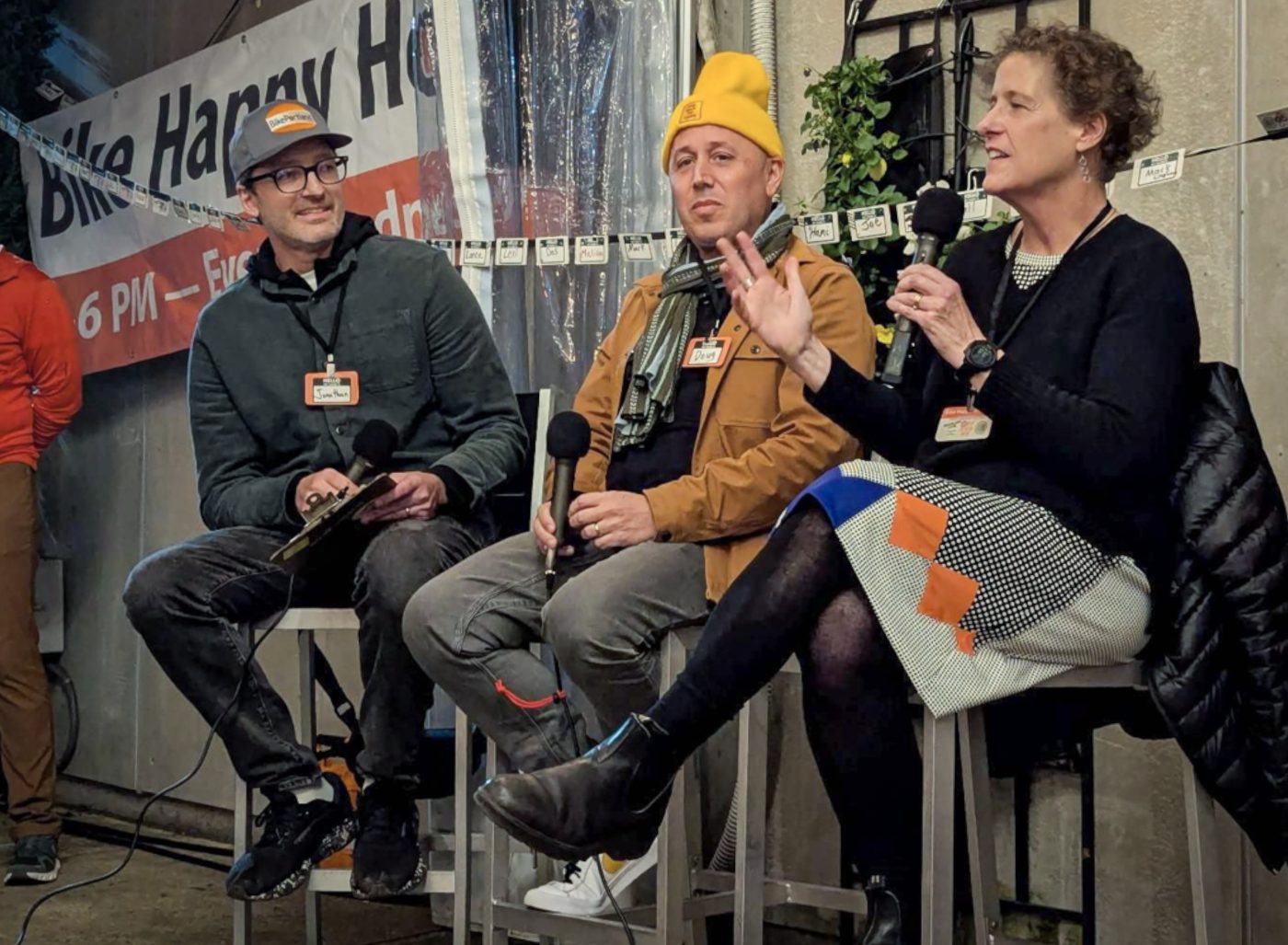 What a thrill it was last night at Bike Happy Hour to share my conversation with Sarah Goodyear and Doug Gordon in front of a live audience! Y’all really brought great energy and made the night so memorable for all three of us. I didn’t film the event, or take good photos, so thankfully BHH regular Jana snapped a pic for the lead (and episode cover). Thanks Jana!