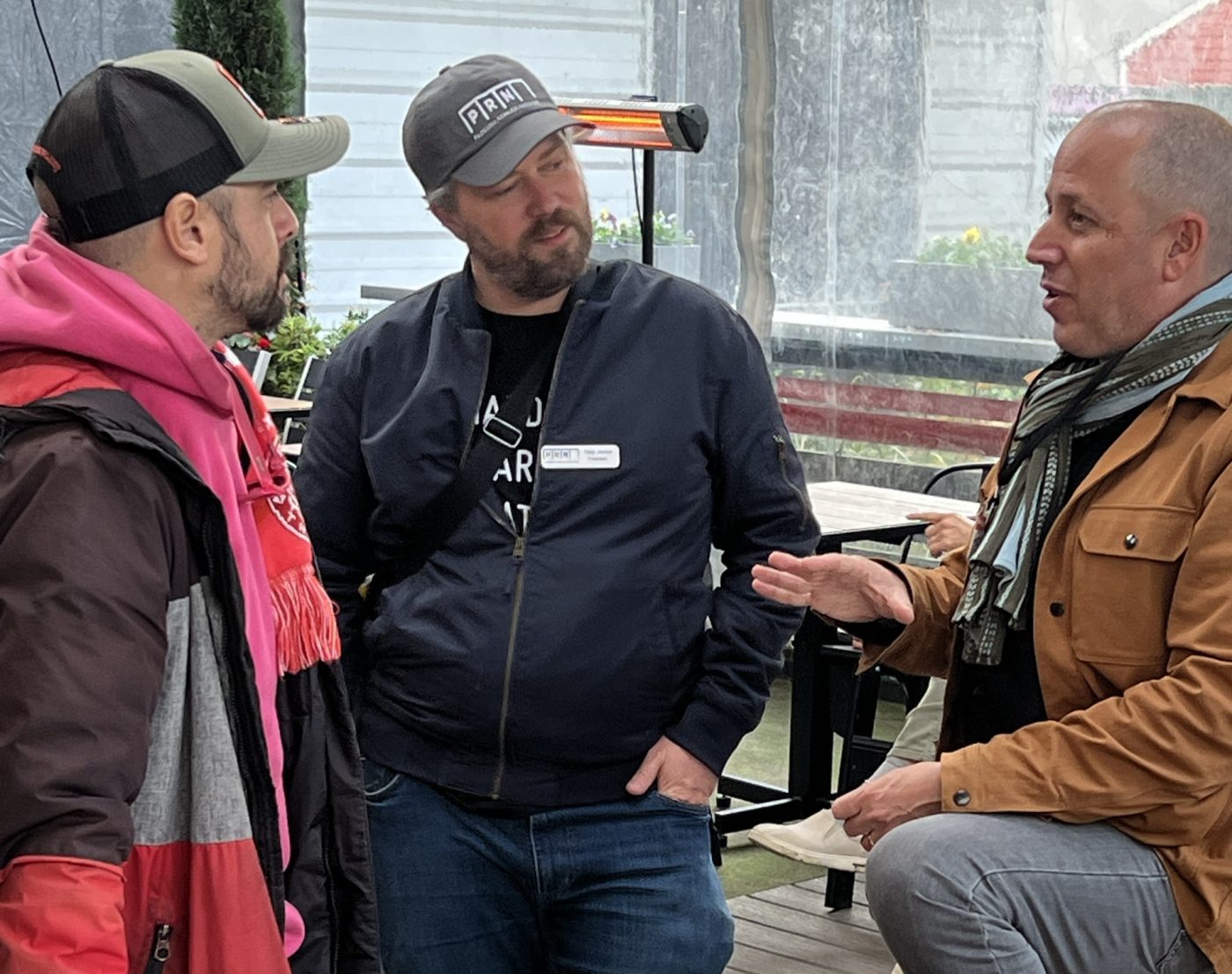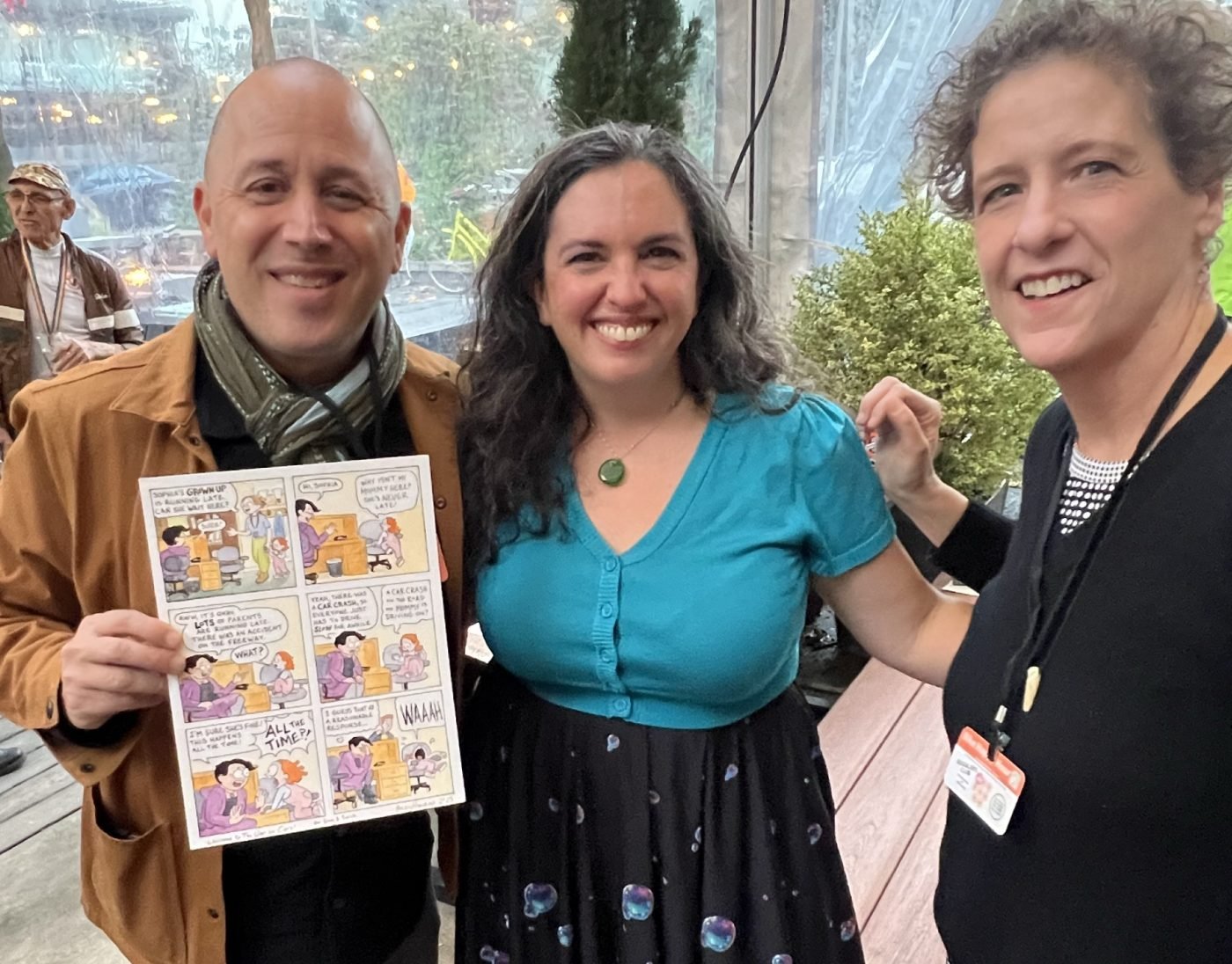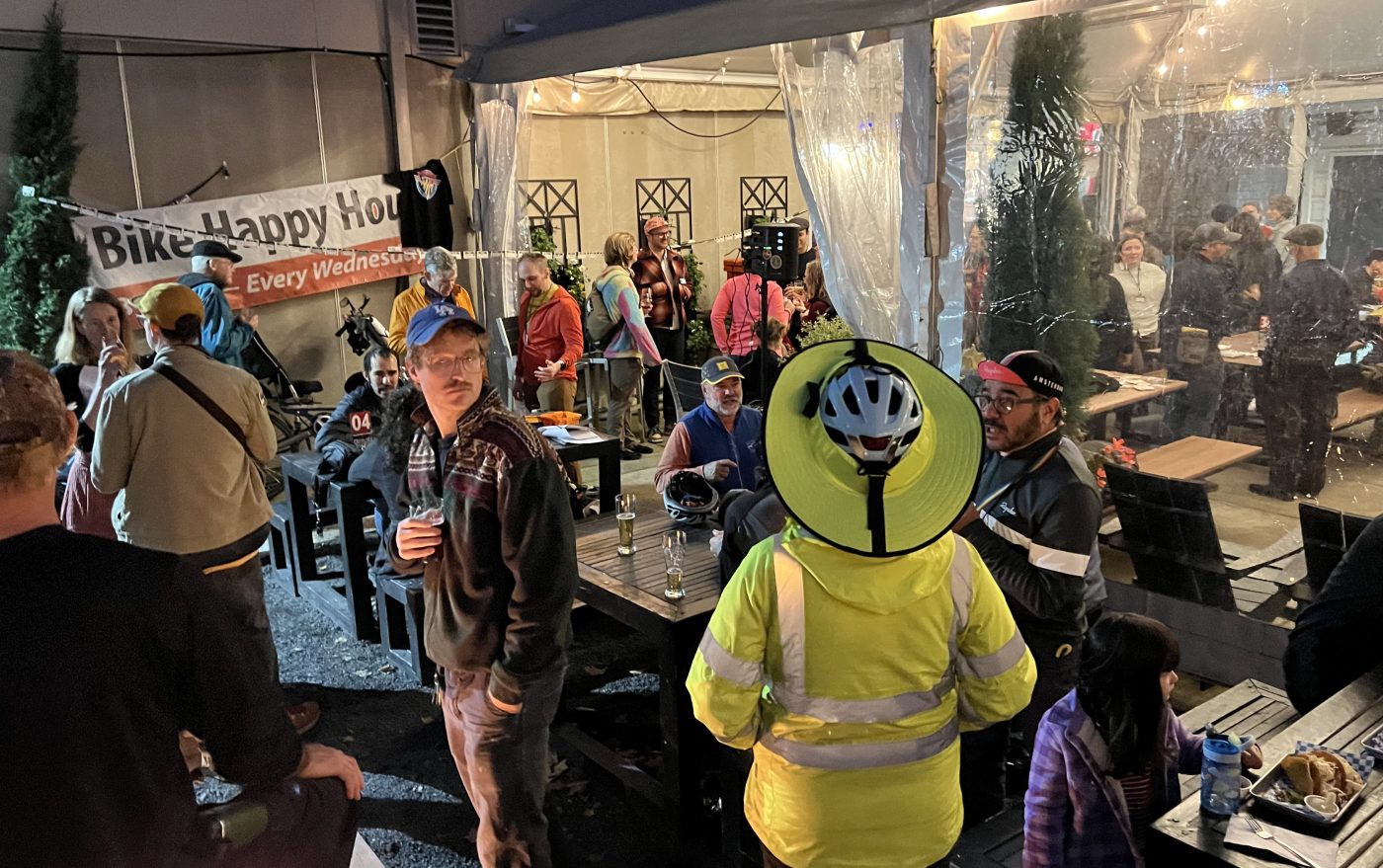 What a thrill it was last night at Bike Happy Hour to share my conversation with Sarah Goodyear and Doug Gordon in front of a live audience! Y’all really brought great energy and made the night so memorable for all three of us. I didn’t film the event, or take good photos, so thankfully BHH regular Jana snapped a pic for the lead (and episode cover). Thanks Jana!