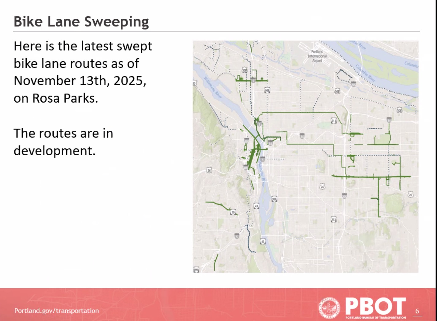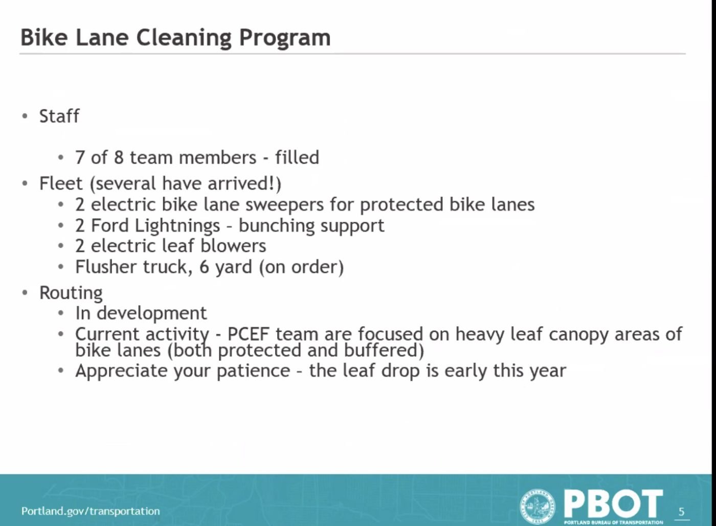 None of these updates are likely to make many Portlanders feel better about the current state of bike lanes — and the vast volume of leaves that have overtaken many of them. “Appreciate your patience, the leaf drop was early this year,” the slide reads.