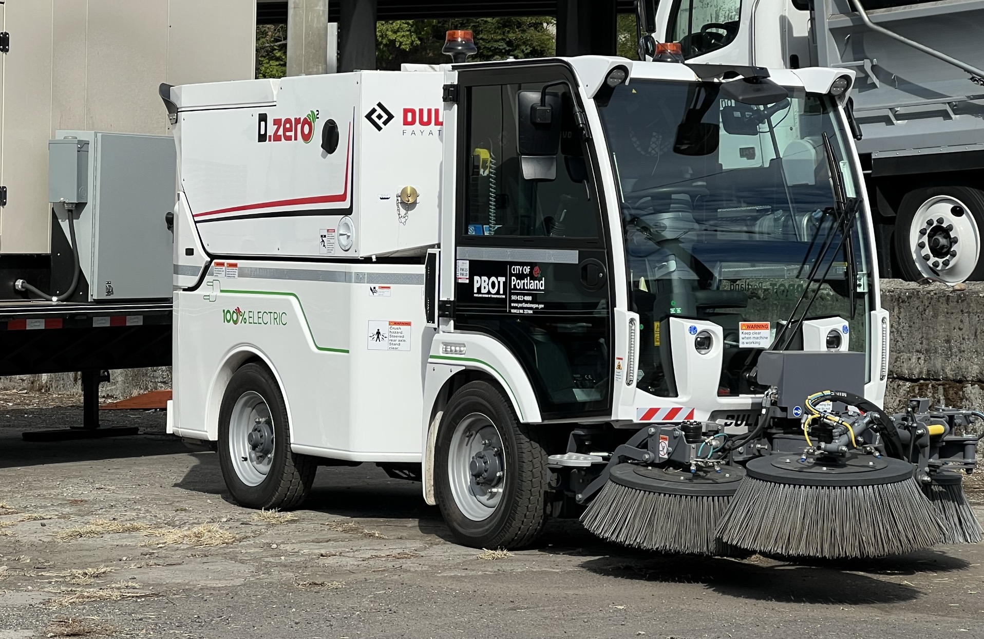 Last night Geller said PBOT has hired seven of the eight new staffers. And so far, two of the new e-sweepers — designed specifically to fit inside protected bike lanes — are already here. I’ve seen both of them parked in PBOT’s Stanton Yard, a maintenance vehicle facility on the corner of N Graham and N Mississippi. The cute little sweepers are dwarfed by a massive diesel generator (which I hope isn’t their final solution for charging these babies). According to a slide shown at the BAC meeting last night, in addition to those two e-sweepers, PBOT has purchased two Ford Lighting pickups for all the hand sweeping and more detailed clean-up work a mechanical sweeper can’t do (aka “bunching support”).