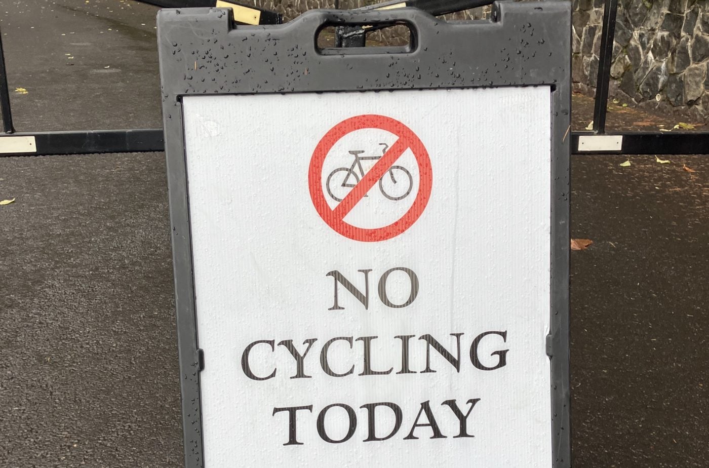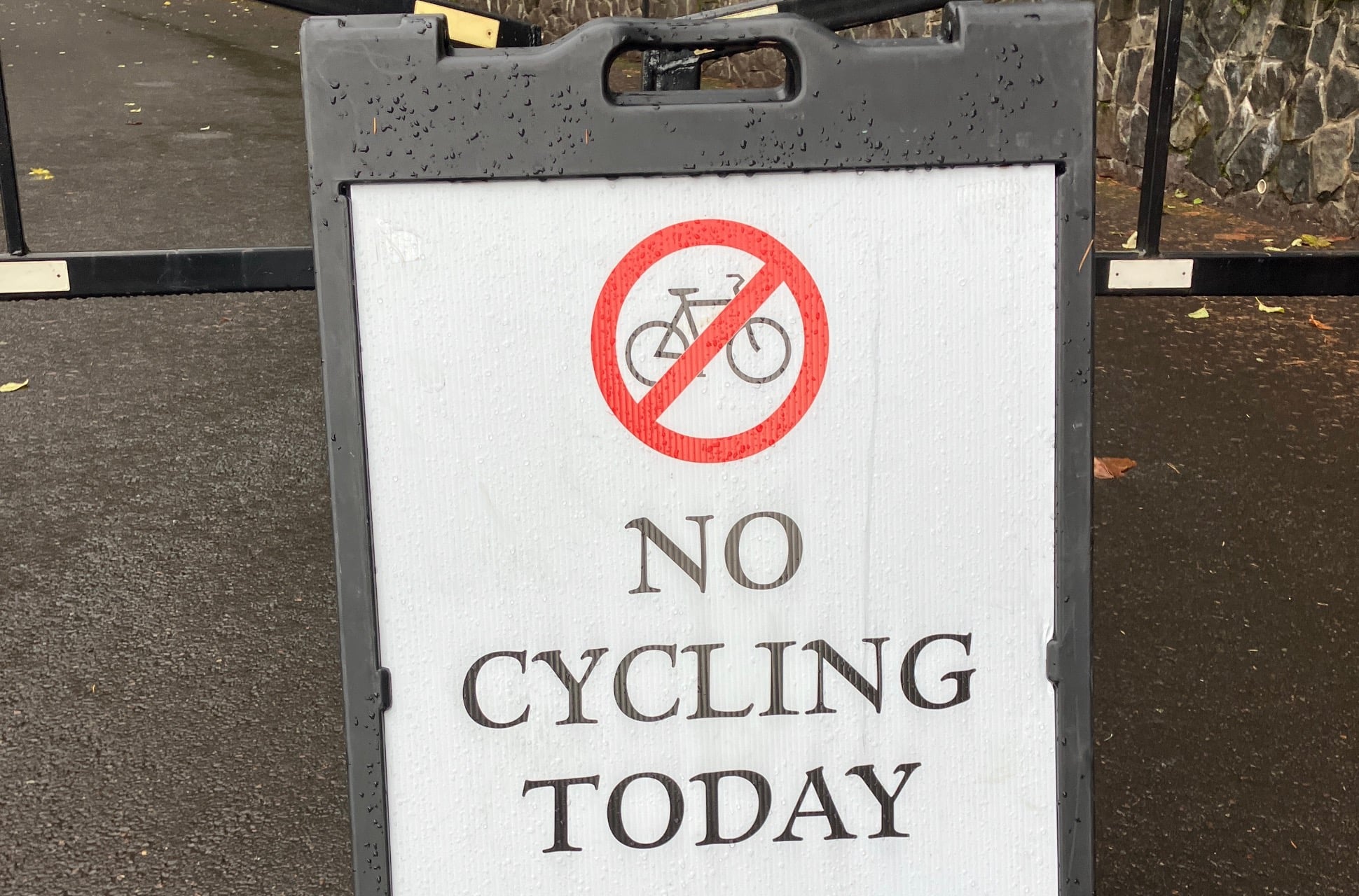 One BikePortland reader came across the “No Cycling Today” sign at the bottom gate just west of the Sellwood Bridge today.