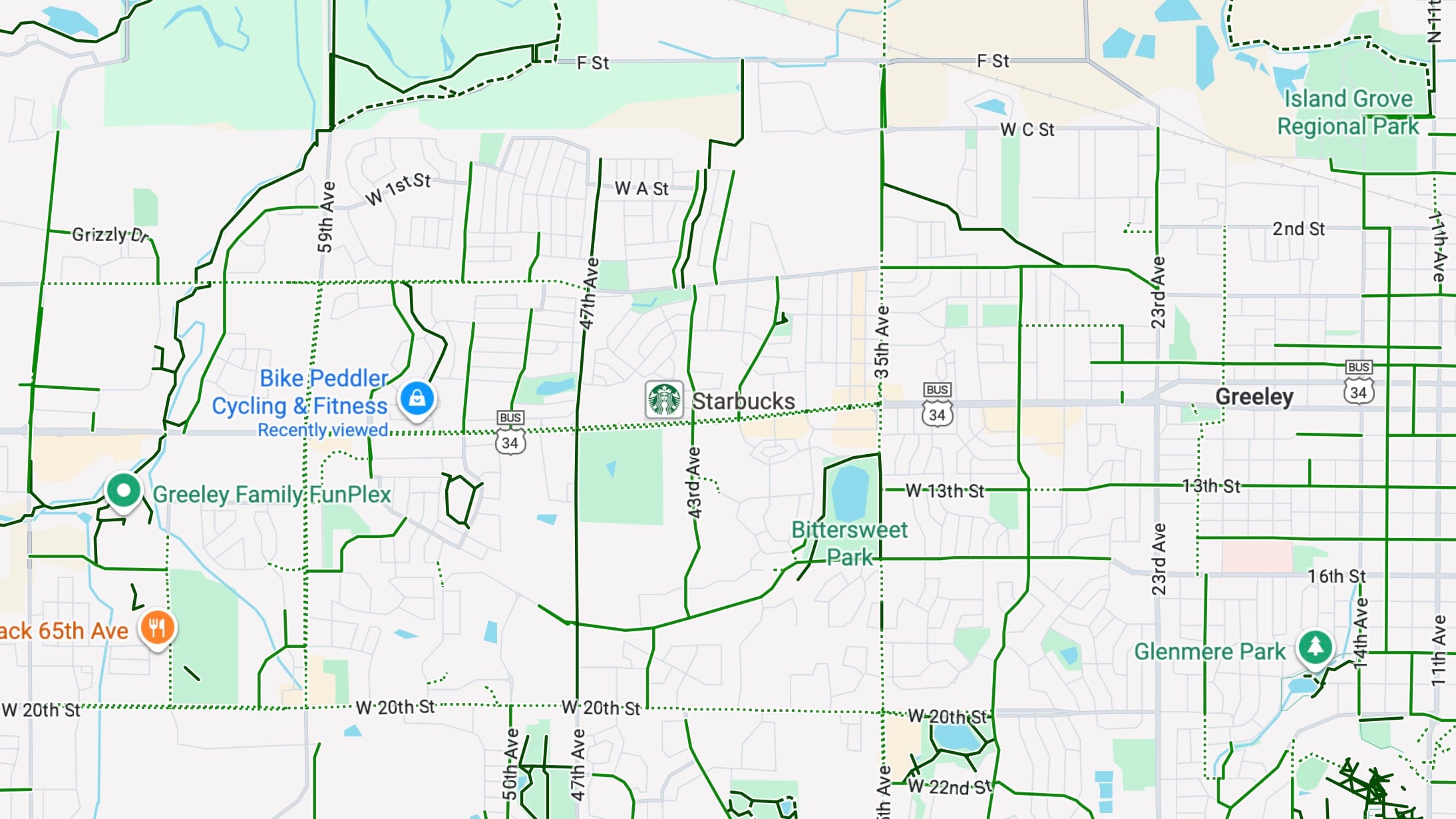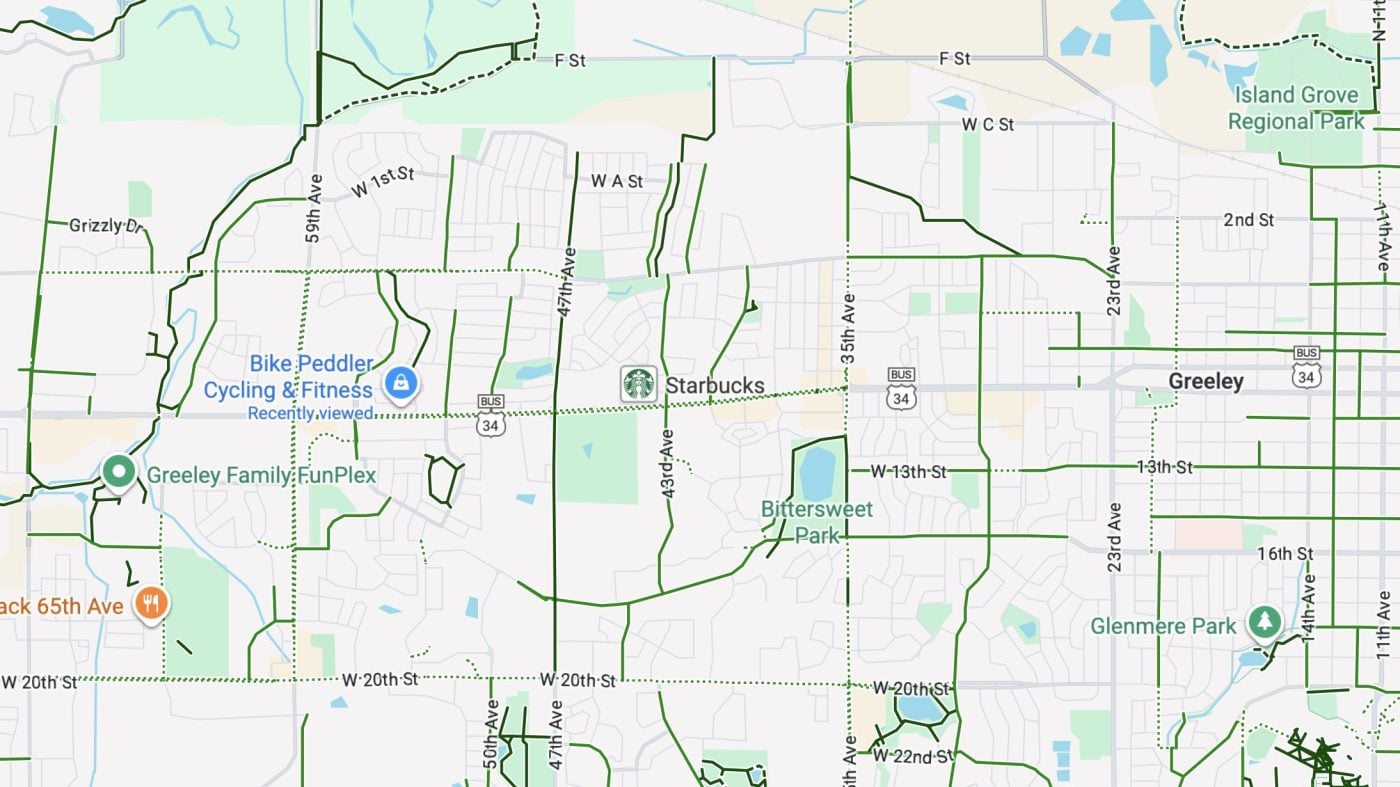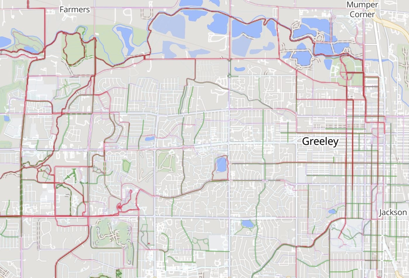 From a bicycling perspective, there’s not a lot to write about. The League of American Bicyclist gave Greeley a Bronze award for its bicycle friendliness, but from what I can tell the city’s 85 miles of bike lanes are most just standard, painted lanes — often next to high-speed car traffic. To Lee’s credit, Greeley has recently made more noise for transportation reform: They launched a bike share system in October 2024 and by the following spring they’d deployed 250 bikes along with 80 shared electric scooters (about 25% of all bike share use is on the local college campus).