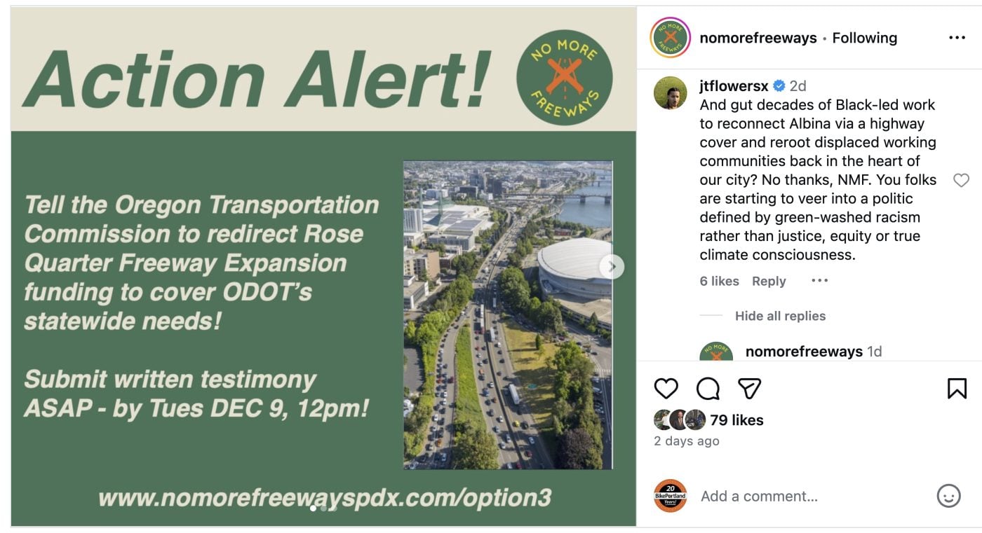 When the group posted their message on Instagram, JT Flowers replied in the comments. Flowers is director of government affairs for Albina Vision Trust, the nonprofit that in many ways controls the future of the project. To be clear, Flowers was writing from his personal account (I’ve reached out to him for comment and have not yet heard back), but his candor and critique of No More Freeways raised eyebrows.
