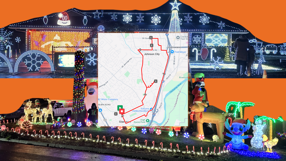 Starting at the Gladstone holiday tree the route takes you through the adjacent neighborhood over to the sharrowed bike lanes on Webster Road. From there it’s a right hand turn onto Ridgewood Drive where nearly all the houses are decorated. This street is similar to Starkwood in East Portland, consisting of a dead-end street and three cul-de-sacs on the west side. I rode all the way to the end of Ridgewood, then looped through the cul-de-sacs on the way out. It is worth noting that directly across Webster from Ridgewood Drive is Clayton Way where most of the houses are likewise holiday decorated.