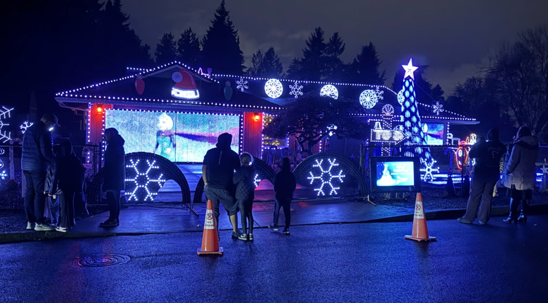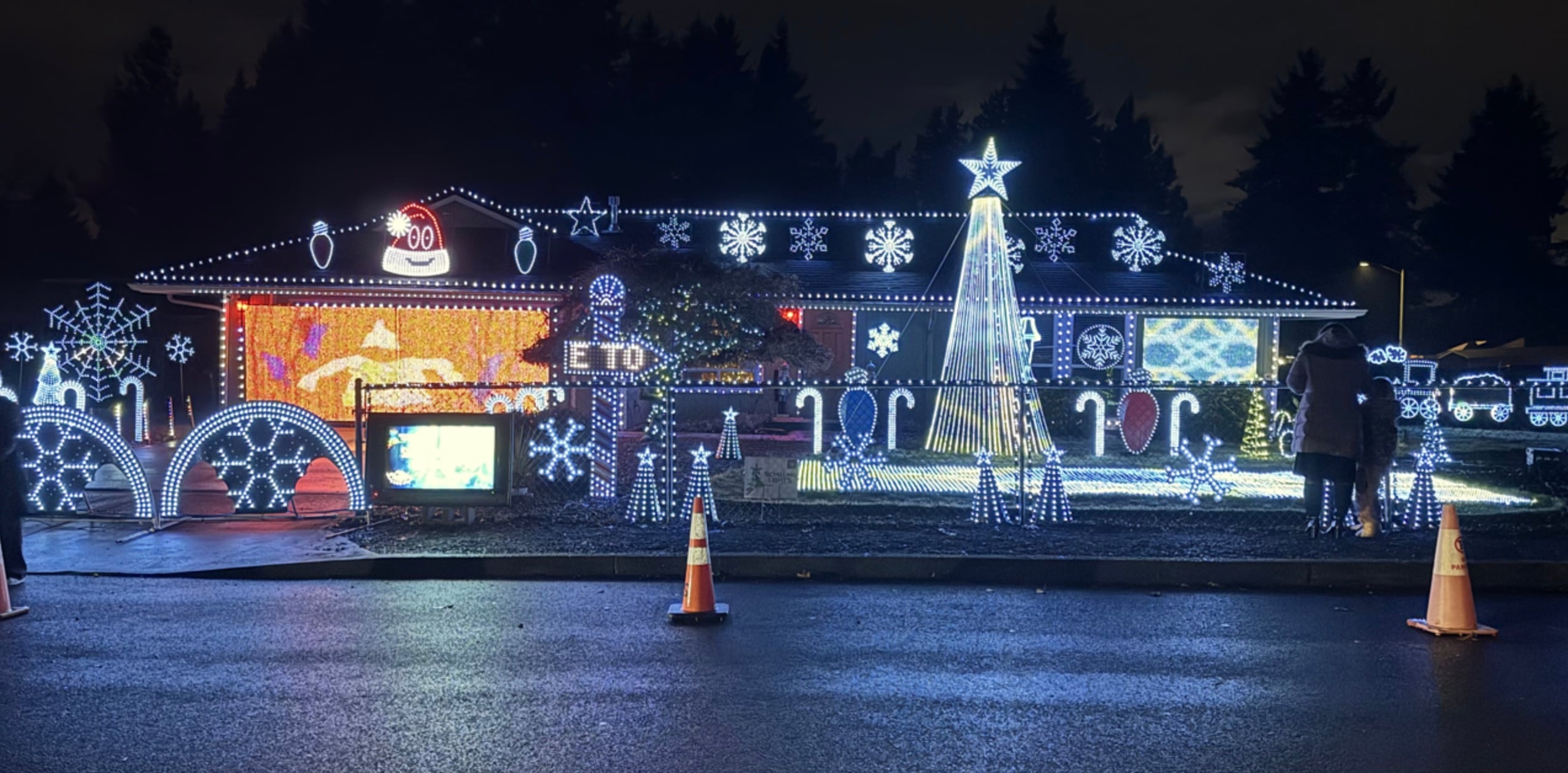 Turning left on SE Lark Avenue, the route takes you to Schilling Lights on Lark, one of most impressive animated light displays in the entire Portland region. The house and large yard are covered with programmed lights that dance in patterns with scenes from holiday classics like “How the Grinch Stole Christmas” and “Home Alone.” Those scenes are displayed on a giant pixel screen that completely covers the double garage doors. During my visit the song “Let It Go” from the movie “Frozen” was played along with spectacular dancing lights throughout the yard.