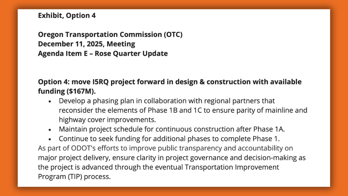“I find your comments very persuasive,” responded Commissioner Lee Beyer (a former state legislator and one of the architects of the 2017 transportation bill that funded the Rose Quarter project). And so too did the other three commissioners present at today’s meeting. They all voted to support Option 4. The plan now is to bring this issue back to the OTC in February or March with a more detailed preliminary construction plan — a plan that is shaped by project partners and not just ODOT staff.