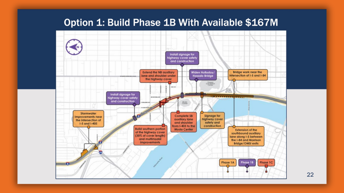 As I reported last month, the beleaguered, $2 billion project that aims to expand I-5 between I-84 and the Fremont Bridge and build highway caps and other surface street improvements, faced the possibility of being defunded by the Oregon Transportation Commission (OTC). After years of delays due to lawsuits, a skyrocketing price tag, and a political roller coaster ride, the project is at a low point. Desperate to maintain inertia, the Oregon Department of Transportation asked the OTC how to spend the remaining $167 million in the project’s construction coffers. Option 1 would use the money to begin an early phase of construction, Option 2 would use the funds to finish design and make it shovel-ready for full construction later on, and Option 3 would pause funding and re-allocate it to other projects (note that ODOT claims the funds could only be used on other regional highway expansion projects).
