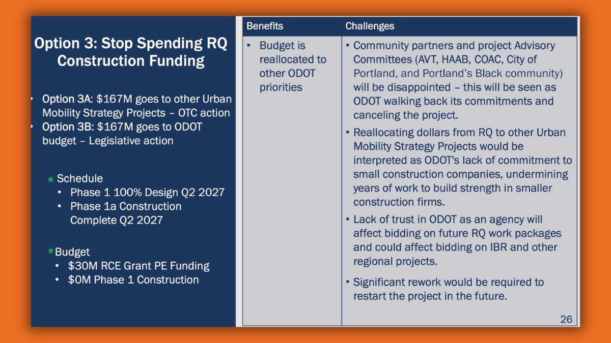 ODOT Rose Quarter Program Director Monica Blanchard poked serious holes in Option 3, saying that, in addition to ODOT staff and project advisory committees being against it (big surprise), “Portland’s Black community would this as walking back on commitments, and cancelling the project would be further eroding their trust in ODOT.”