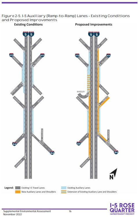 A similar hazard will be present for northbound traffic. NB I-5 users will now have to change lanes TWICE to exit at Weidler/Moda Center or I-405, first weaving to their right across the auxiliary lane ending at Greeley and then changing lanes into the auxiliary lane to I-405 Weidler exit. NB I-5 users wishing to exit at Greeley will have to decide when to weave and change lanes at I-84, at Weidler, or after I-405 to take the Greeley Ave exit. Users from Broadway on ramp will have to change lanes TWICE to get onto NB I-5 and users in one of the I-84 on ramp lanes will have to change lanes TWICE to get onto NB I-5