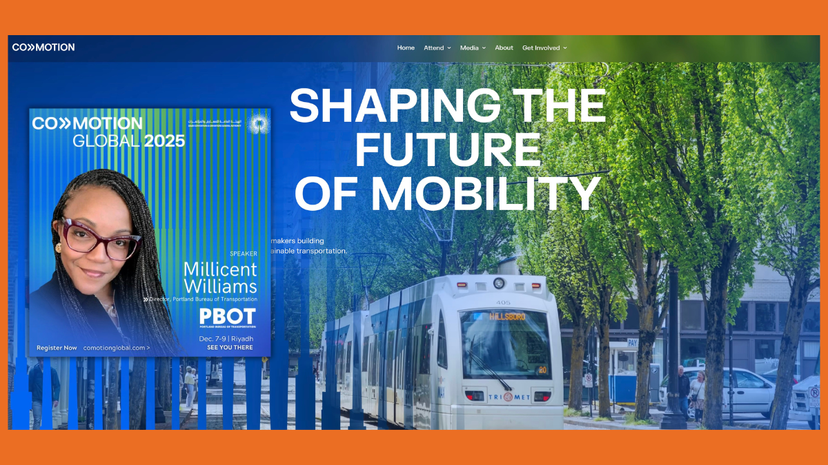 Williams participated in a panel at CoMotion Global ’25, an event held in the city of Riyadh that, “connects the brightest minds, cities, and companies shaping the next chapter of transportation — globally.” Her panel was titled, “Managing Cities in the New Age of Data” (you can watch it here). The front page of the event website features a TriMet MAX train in downtown Portland.
