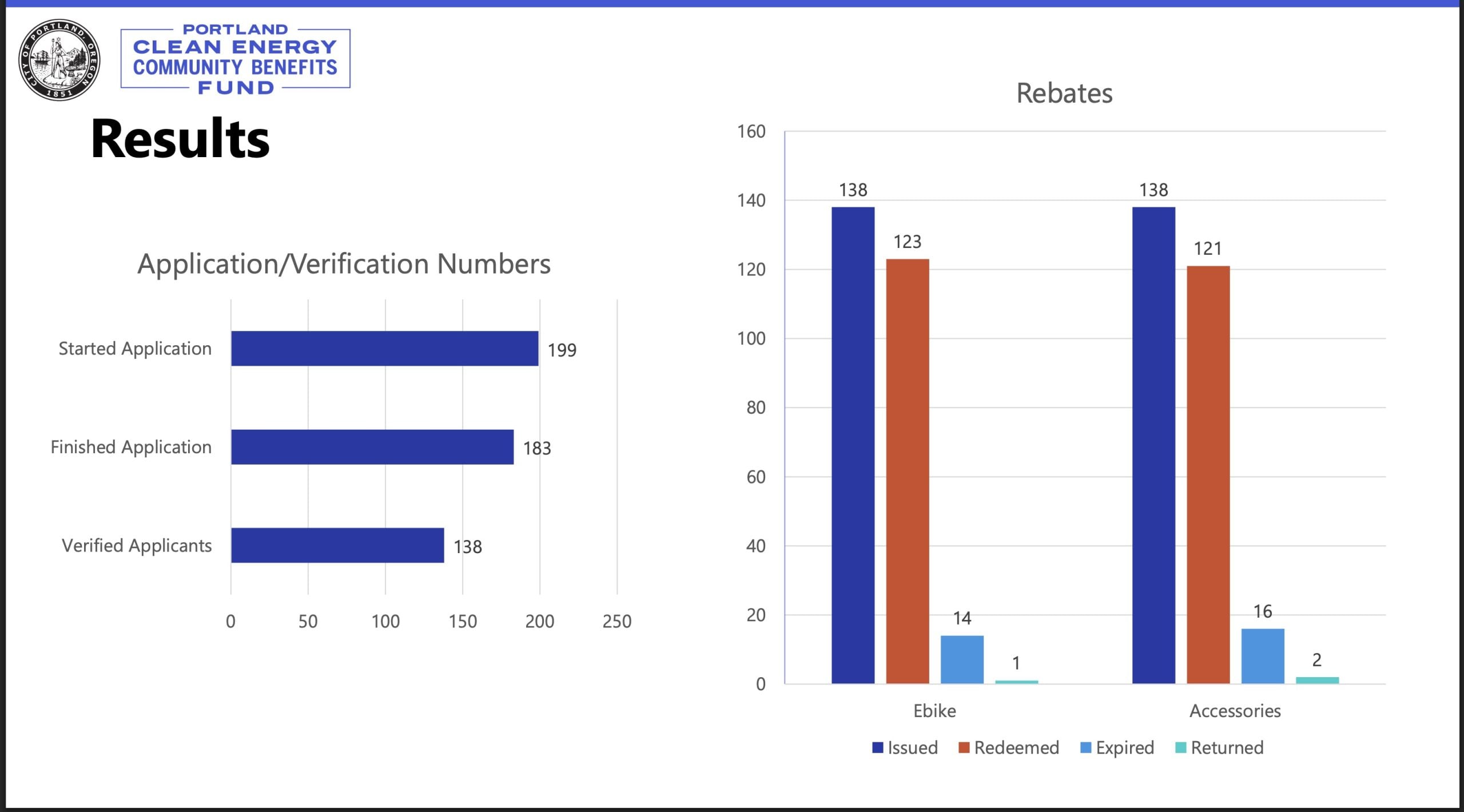 The pilot offered rebates of $1,600 for e-bikes and $300 for accessories to Portland Community College students. A presentation shared last night revealed that 183 of them finished the application and 138 were ultimately verified. The program directs rebate recipients to specific types of bicycles (Class 1 e-bikes with a 20 mph top speed and no throttle only) at authorized e-bike retailers.