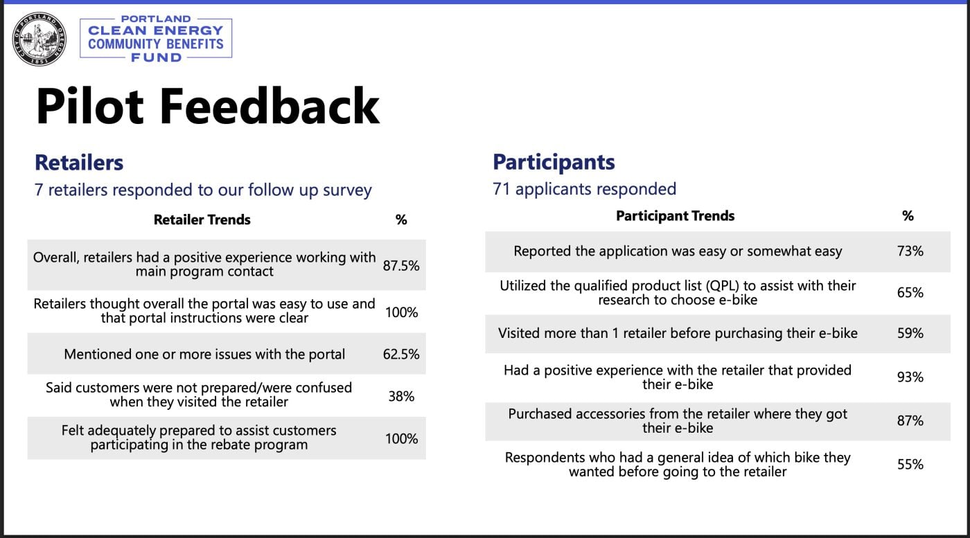 13 local bike shops redeemed at least one rebate. The two shops with the most rebates processed were A Convenient Cycle and The e-Bike Store who both sold 31 bikes through the program. Other top sellers were Trek Bicycle Westmoreland (30), Vvolt (27), Sellwood Cycle Repair (25), and Trek Bicycle Slabtown (24). A big measure of success for the pilot is that 88% of retailers said they had a positive experience working with program staff and 100% of respondents said the online portal was clear and easy to use. There were similar levels of good reviews from program participants.