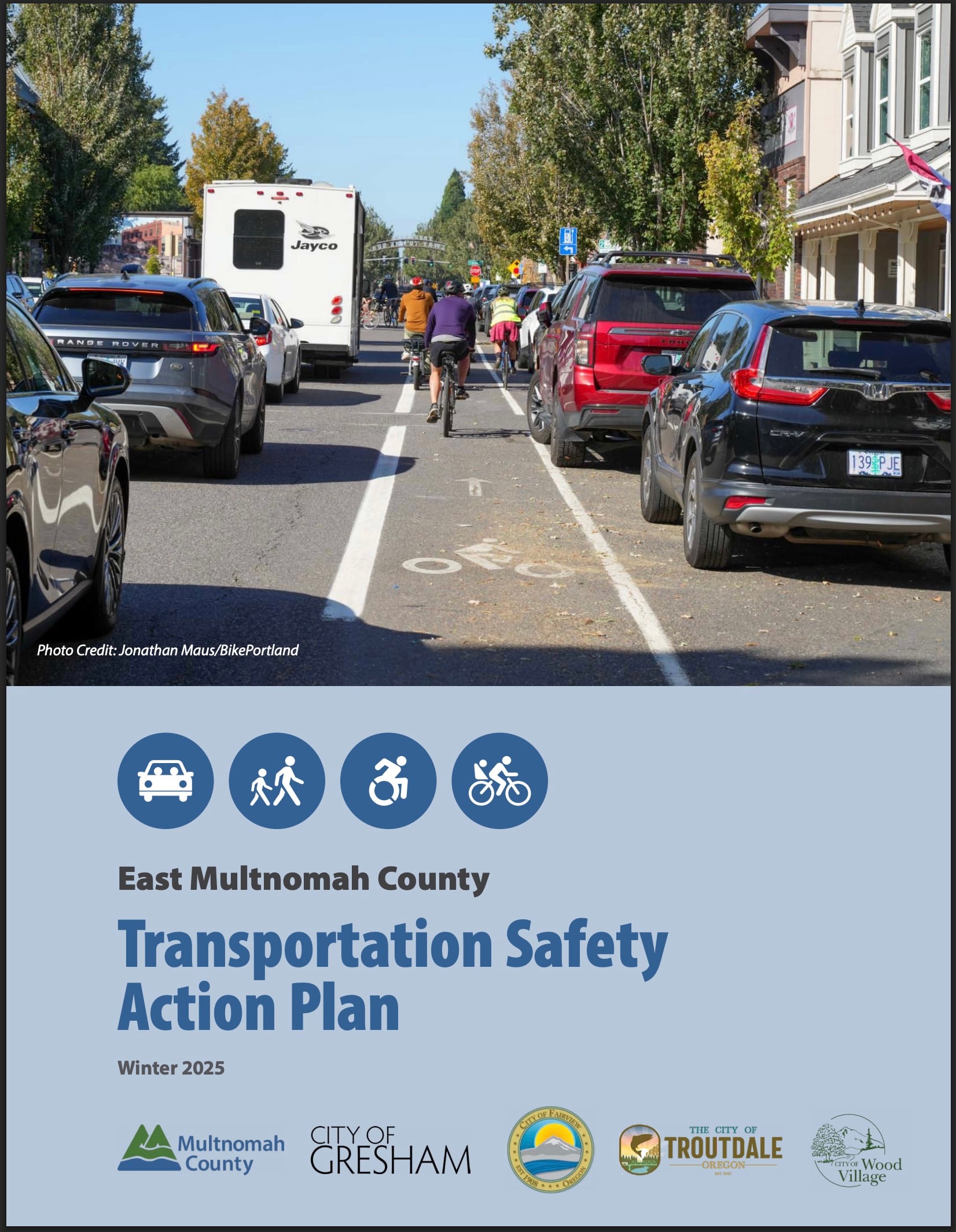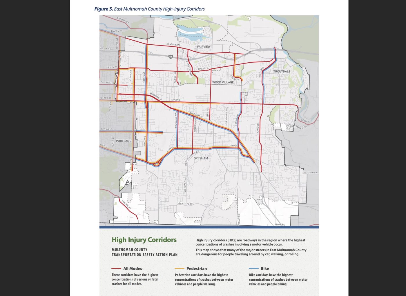 East Multnomah County took a big step toward taming dangerous streets last week when the County Commission voted to adopt their Transportation Safety Action Plan, which comes with the goal of zero traffic deaths by 2035. “No loss of life is acceptable, and we must ensure our streets are safe for all community members to travel, including those who walk, use bicycles, take transit, or use mobility devices,” states the 67-page plan.