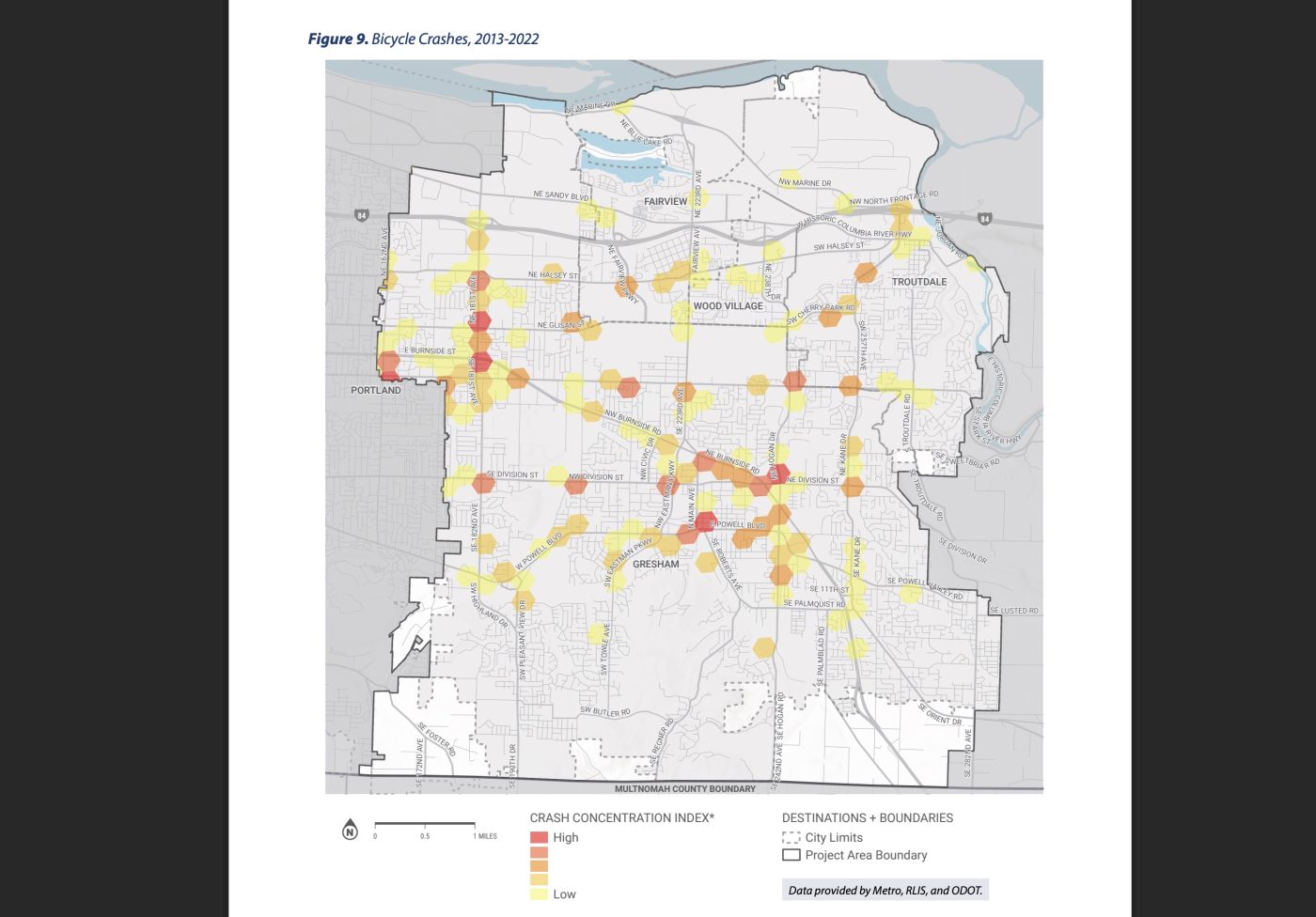 Traffic crashes that result in death or serious injury are a “major public heath concern,” said Multnomah County Health Department Manager Brendon Haggerty at the Commission meeting last week. According to Multnomah County and Oregon Department of Transportation (ODOT) crash data, 104 people died in east County crashes and 473 people were seriously injured between 2013 and 2022. Haggerty said traffic crashes are a leading cause of death for folks who live in East Multnomah County and they are impacted at a disproportionate rate as folks closer to the central city. “For example, we found that the rate of years of potential life lost in East County was roughly double what it was in the central city,” Haggerty told commissioners.
