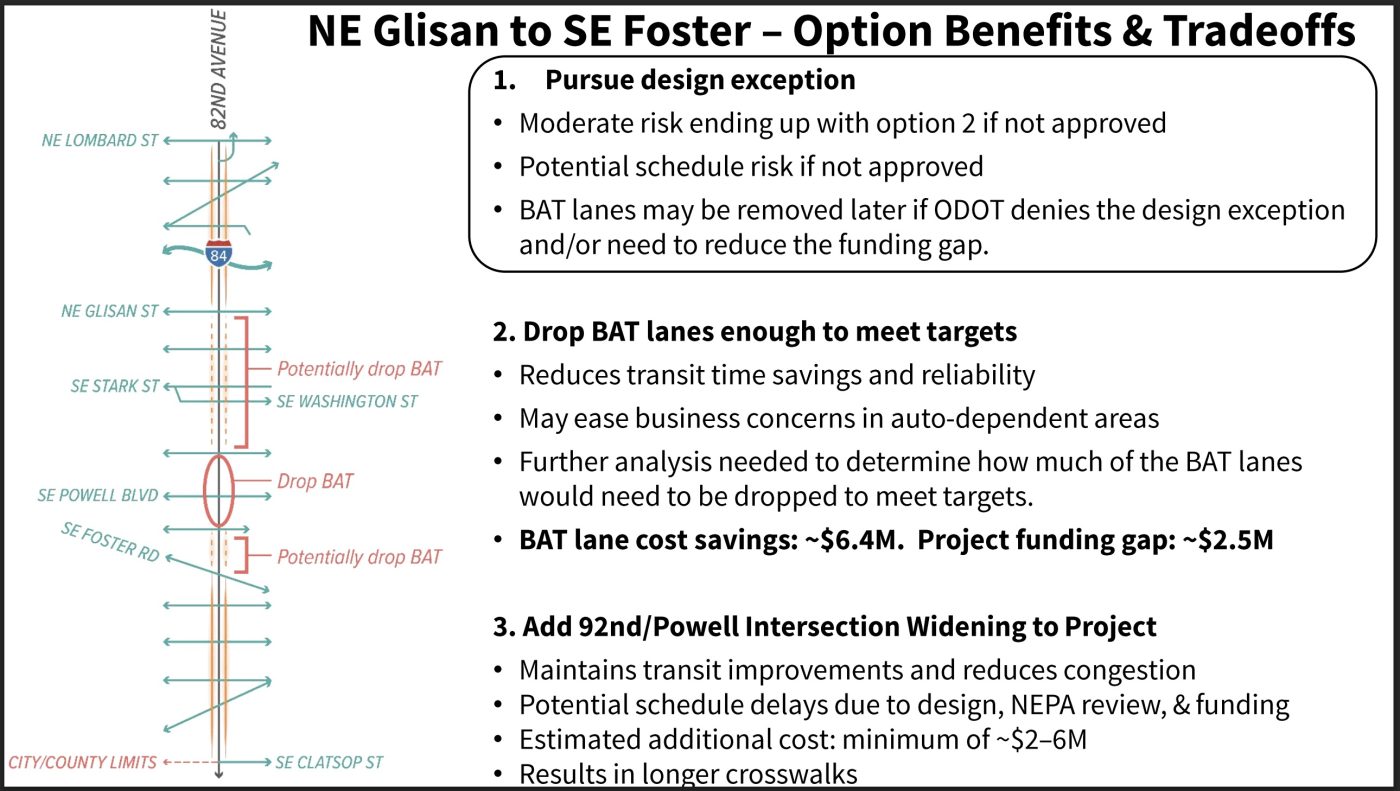 Stemmler explained that the staff recommendation he’ll present at next month’s Policy and Budget Committee meeting will be to drop the BAT lanes at Powell Blvd, pursue a design exception at 92nd (where ODOT said they can live with the impacts to I-205 ramps) and commit to a slight widening of 82nd at Stark and Washington (to accommodate side-by-side left turn lanes). Stemmler also said they’ll recommend pursuing another design exception for two other section between NE Glisan and Foster (see slides below) and would consider dropping BAT lanes north and south of Powell if that exception doesn’t get approved by ODOT.
