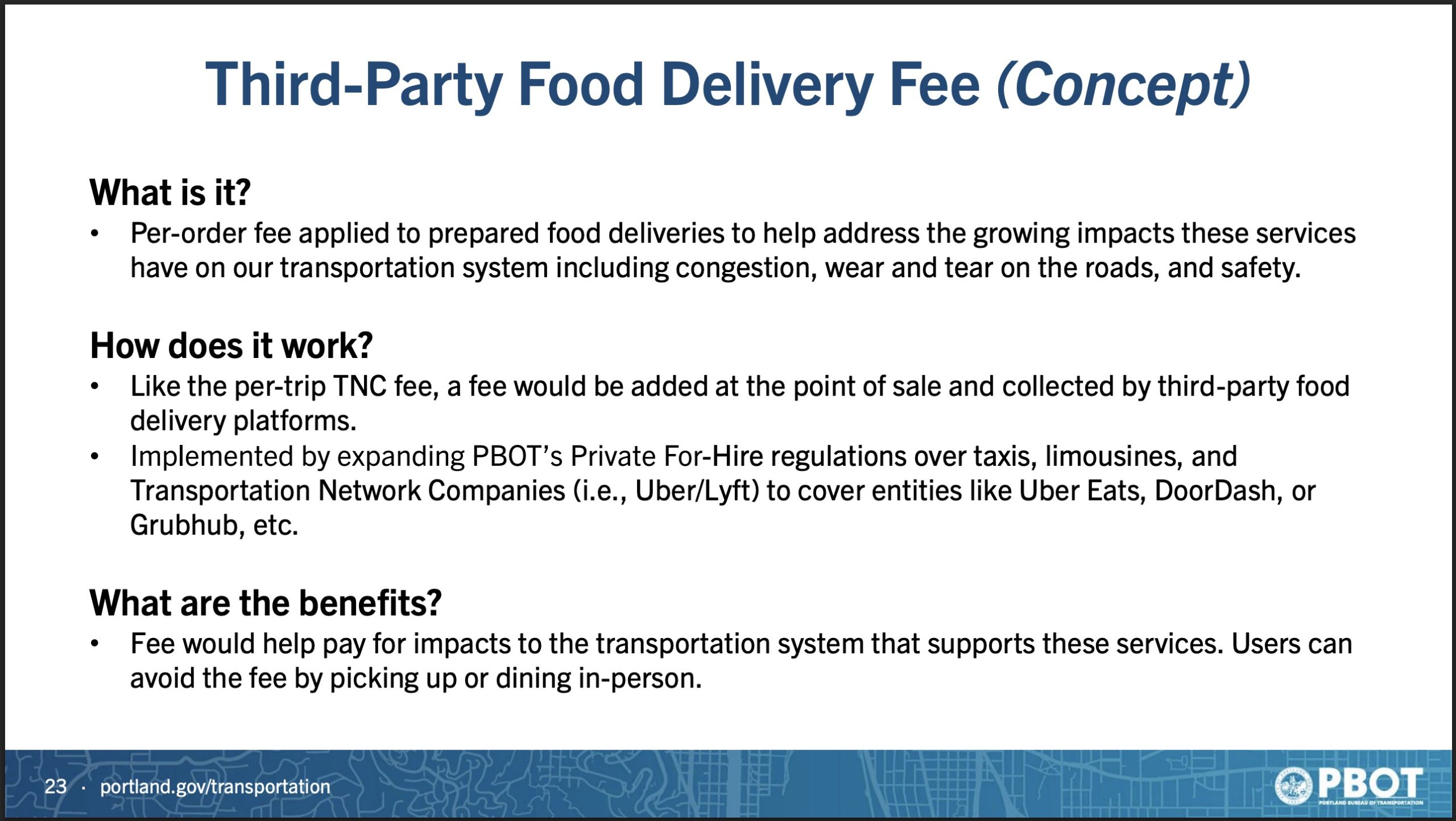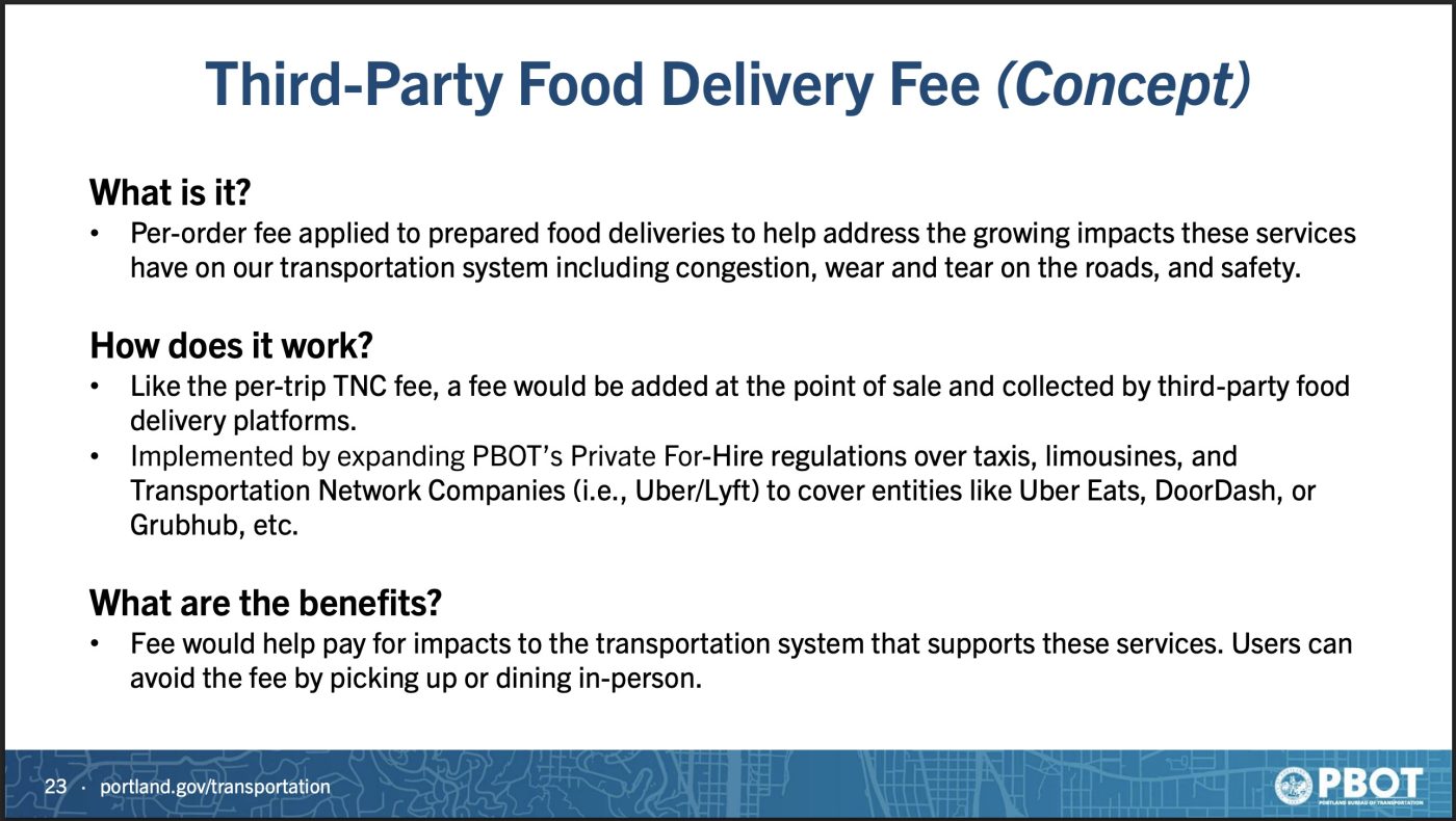 Green also PBOT if they could make food delivered by bikes (or any non-car vehicle) exempt from the fee. “Most definitely,” PBOT staff replied. “Those are things we’ve been thinking about.”
