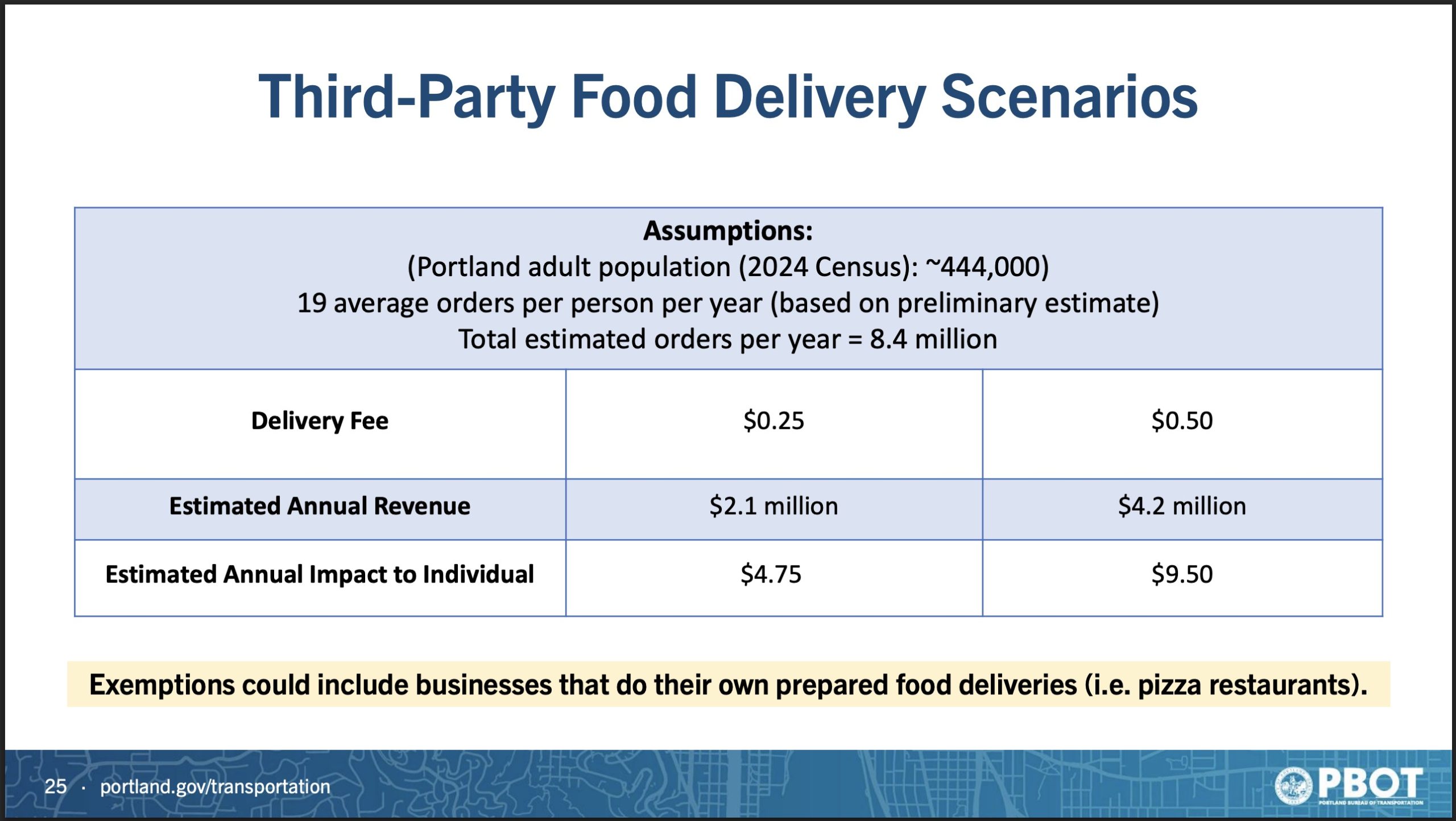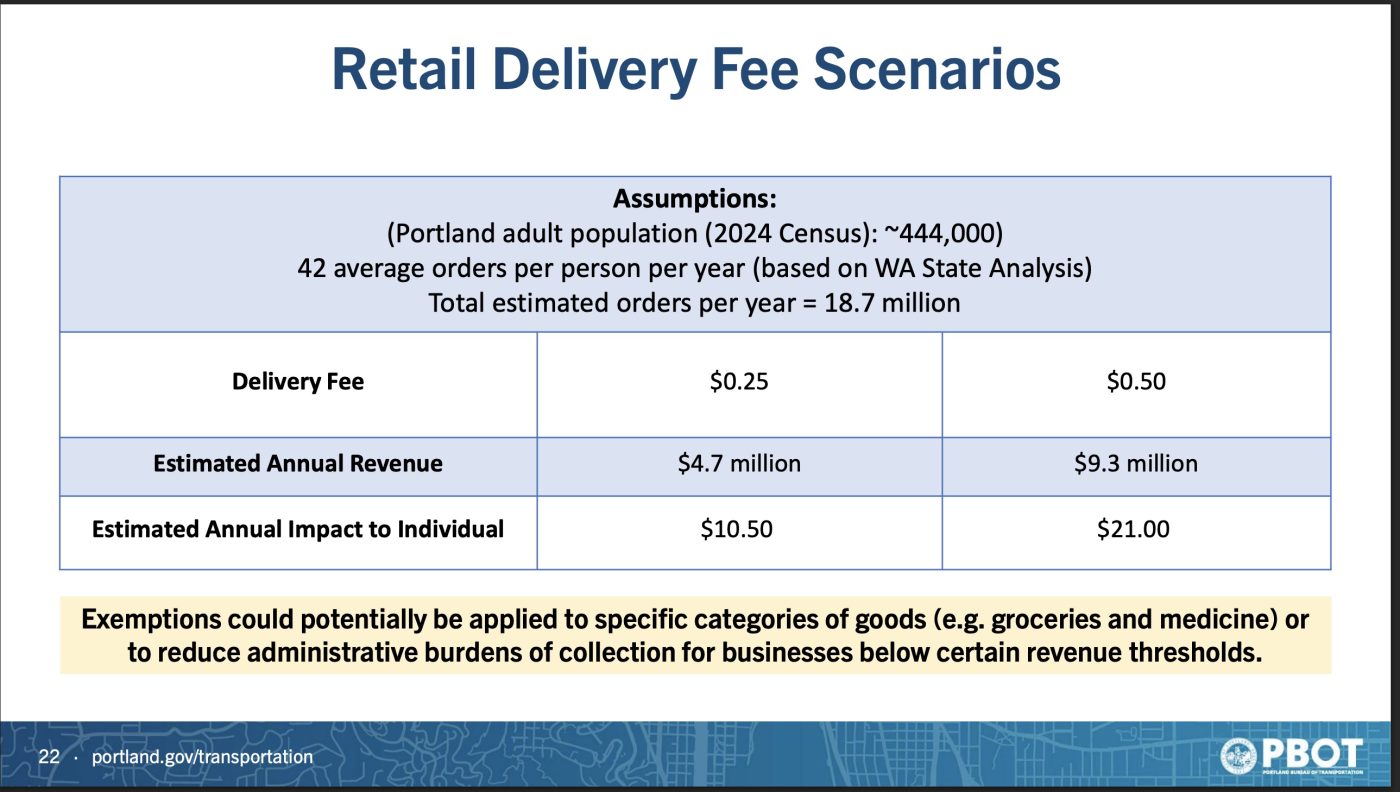 PBOT floated a per delivery fee range between 25 and 50 cents that would raise an estimated $5 million to $9 million per year. Note that exemptions would be made for deliveries that include groceries or medicine.