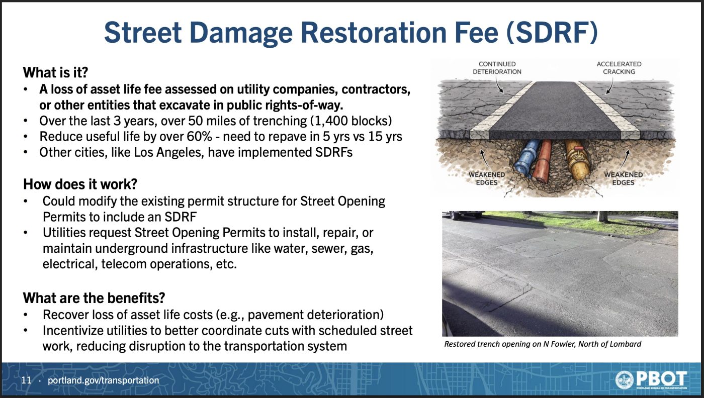This fee would be charged to entities like utility companies who cut into city streets to install pipes and other infrastructure. PBOT estimates that in the past three years Over the last 3 years, various companies and agencies have ripped open 1,400 city blocks. Currently PBOT only charges for administrative costs related to permitting these projects and they do not charge for the street repairs (crazy, right?!).
