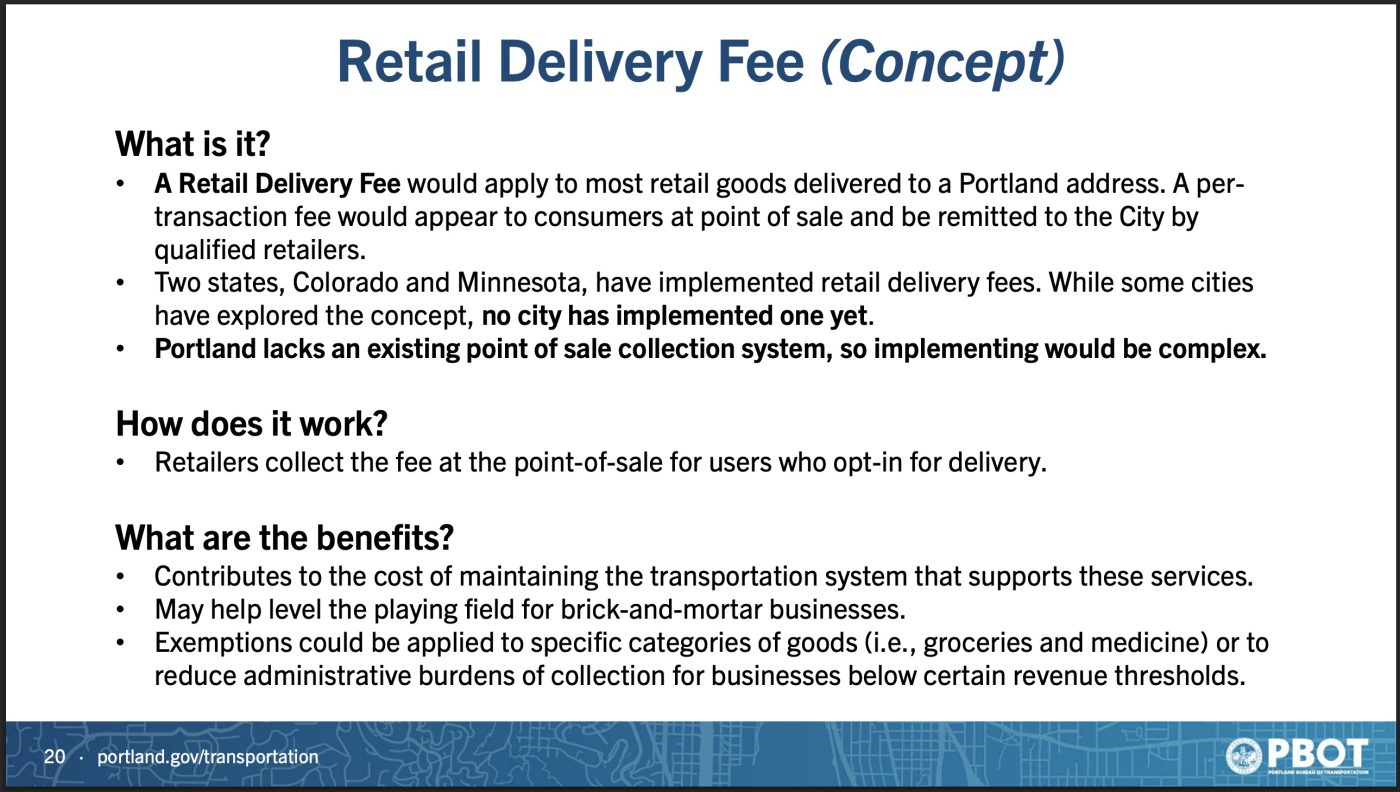 Unlike the two fees above, this one is still in concept phase. It would be charged to consumers who choose to have certain items delivered to their home or business. PBOT Mobility Innovations Manager Jacob Sherman told councilors Monday that two other states have already instituted a retail deliver fee, but Portland would be the first city to do so. With e-commerce exploding by 40% since 2019, PBOT says the time has come for someone to pay for the added trips these purchases add to our road network.
