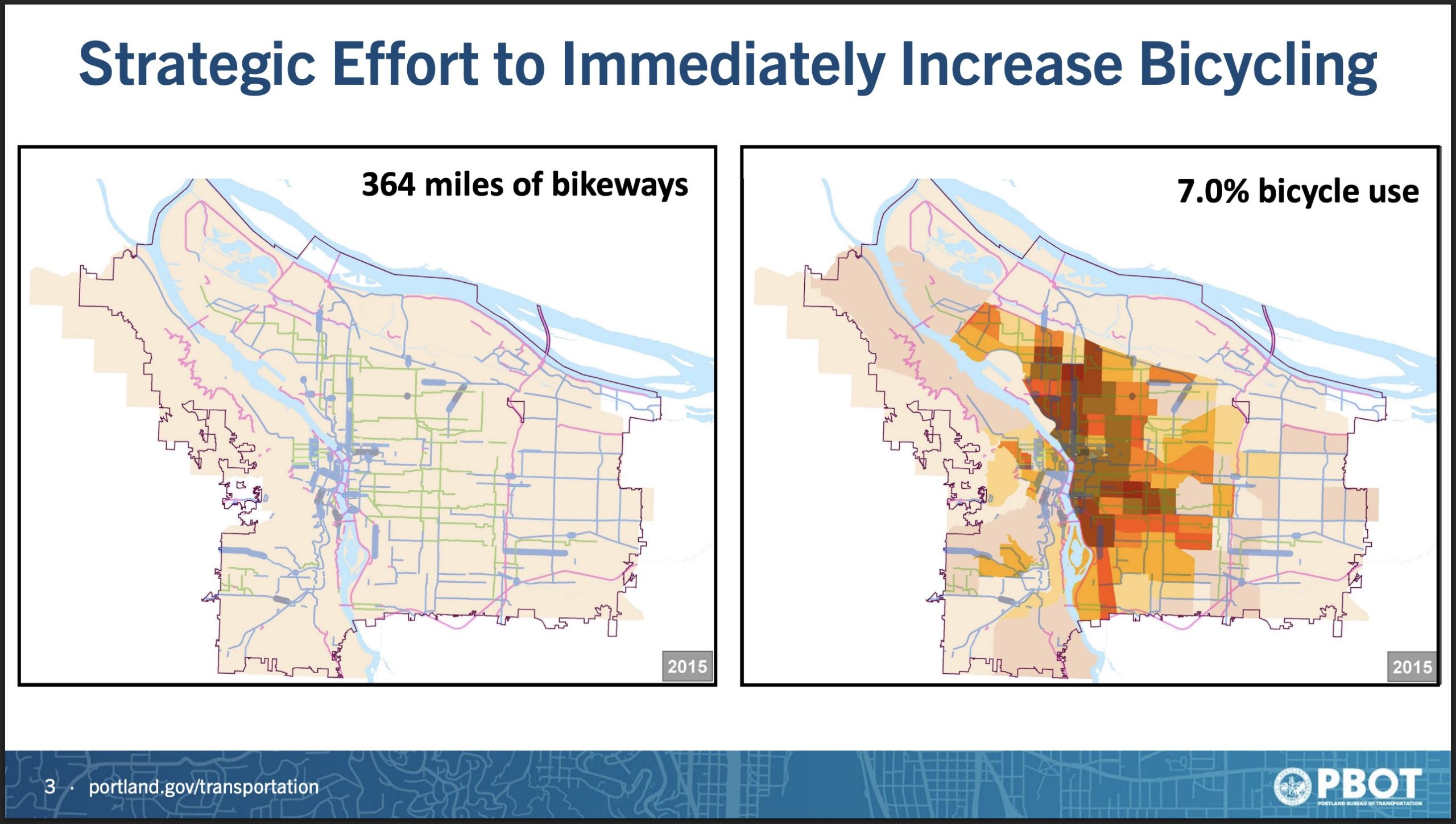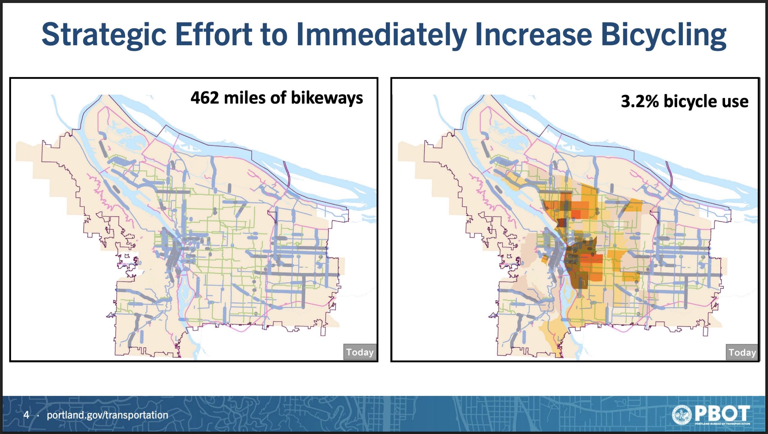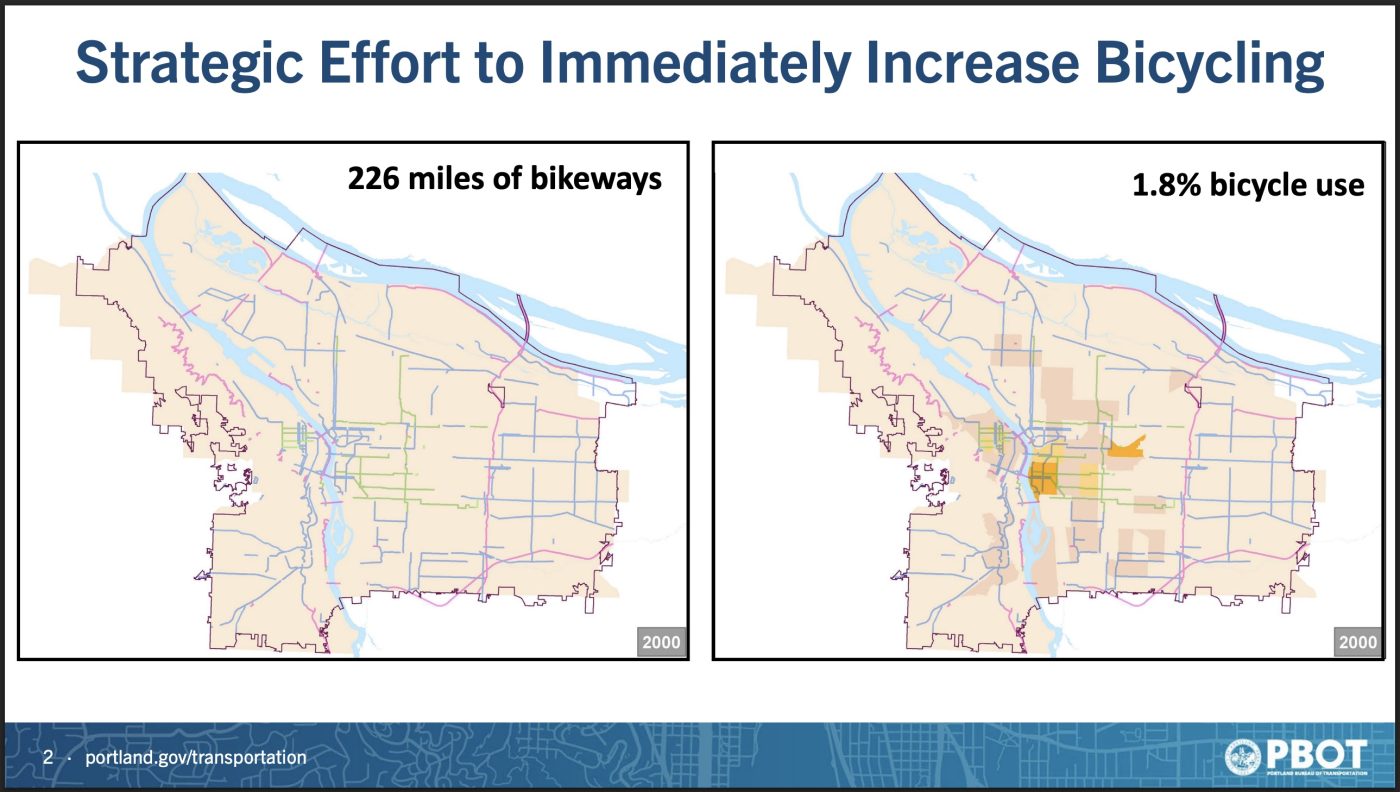 Central to Geller’s thinking is that the existing bike network has more capacity than is being used. “In 2016 the high bike use that we had was based on about 23,000 Portlanders biking daily,” Geller shared with councilors. “Tomorrow, 70,000 Portlanders could decide they wanted to bike, and the system could accommodate them.”