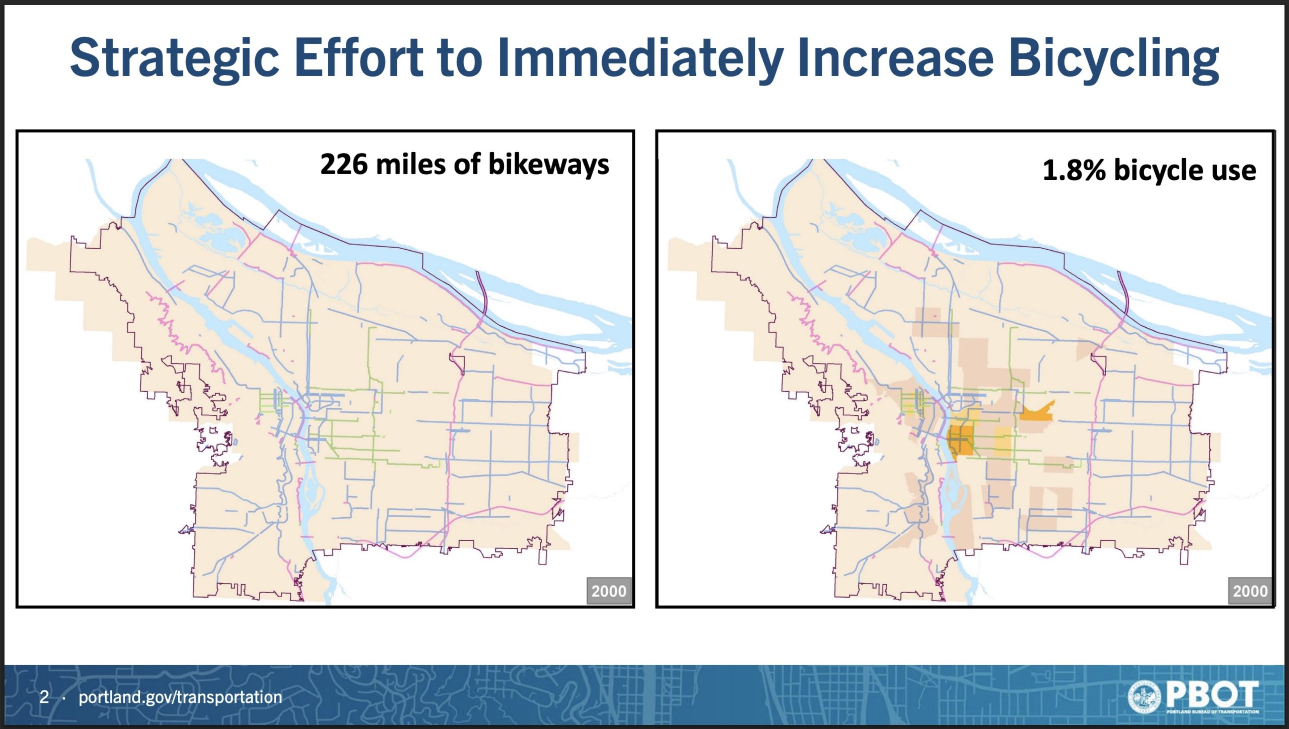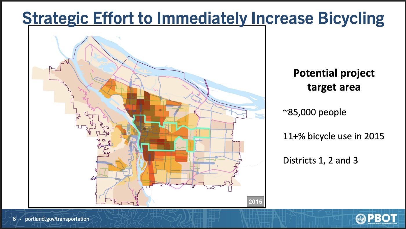 This morning’s meeting was Geller’s first opportunity to explain his idea since it leaked to the community last week. In his testimony and presentation to council, Geller said that despite all the miles of Portland bikeways that have been built, ridership has gone down. “We’ve invested significantly, and we’re not seeing the results just from building the bikeway network.” That’s why Geller wants to turn to grassroots organizing and marketing, along with a few strategic capital investments in the target area.