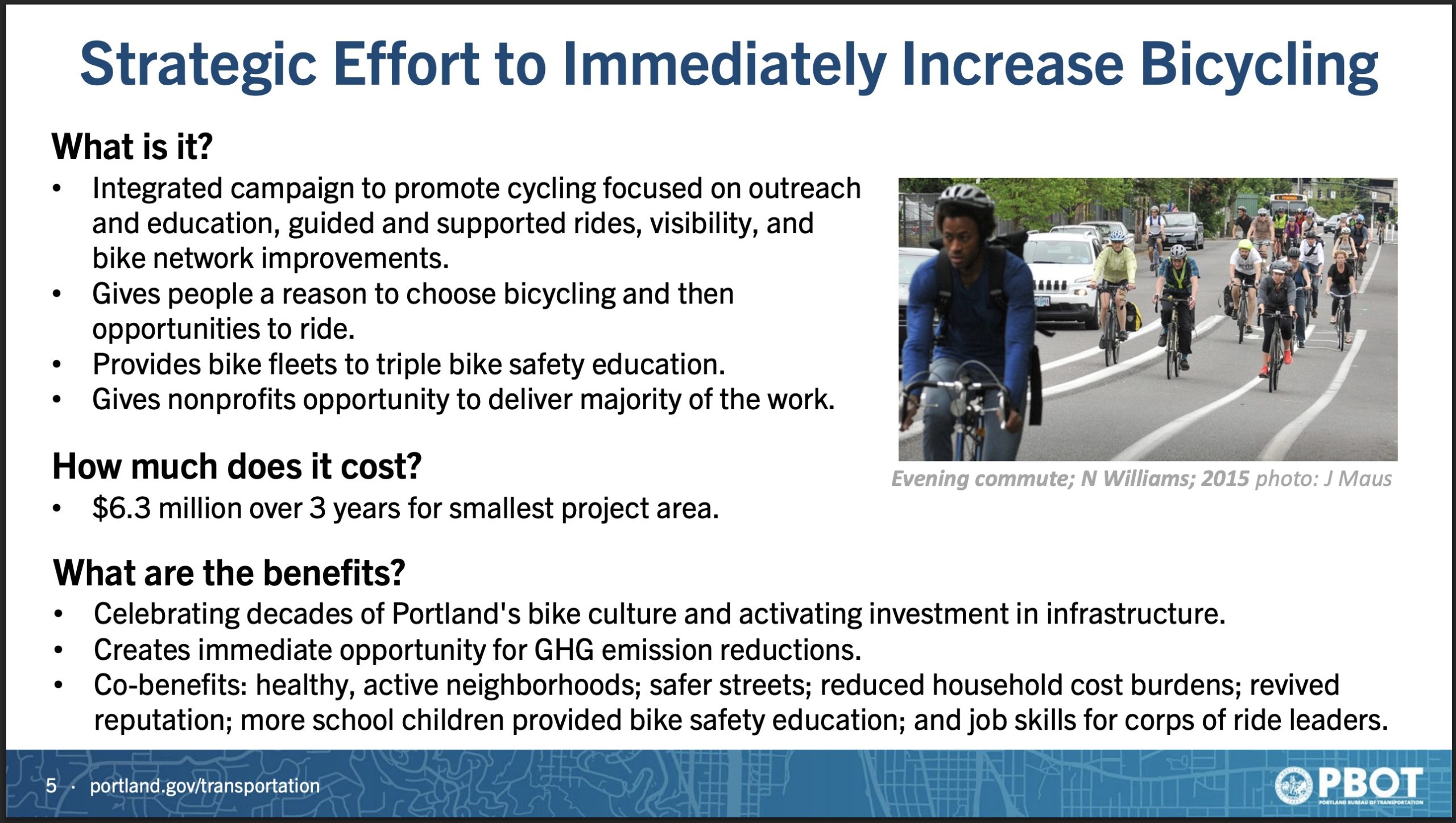 Geller framed his proposal as something that would cost $6.3 million over three years for a relatively small targeted area (that could be larger with more funding). “This program centers on two ideas,” Geller explained. “Giving people a reason to bicycle and then opportunities to do so… the program is predicated on the idea that bicycling is a good product, that it’s transformative at both the personal and societal level.”