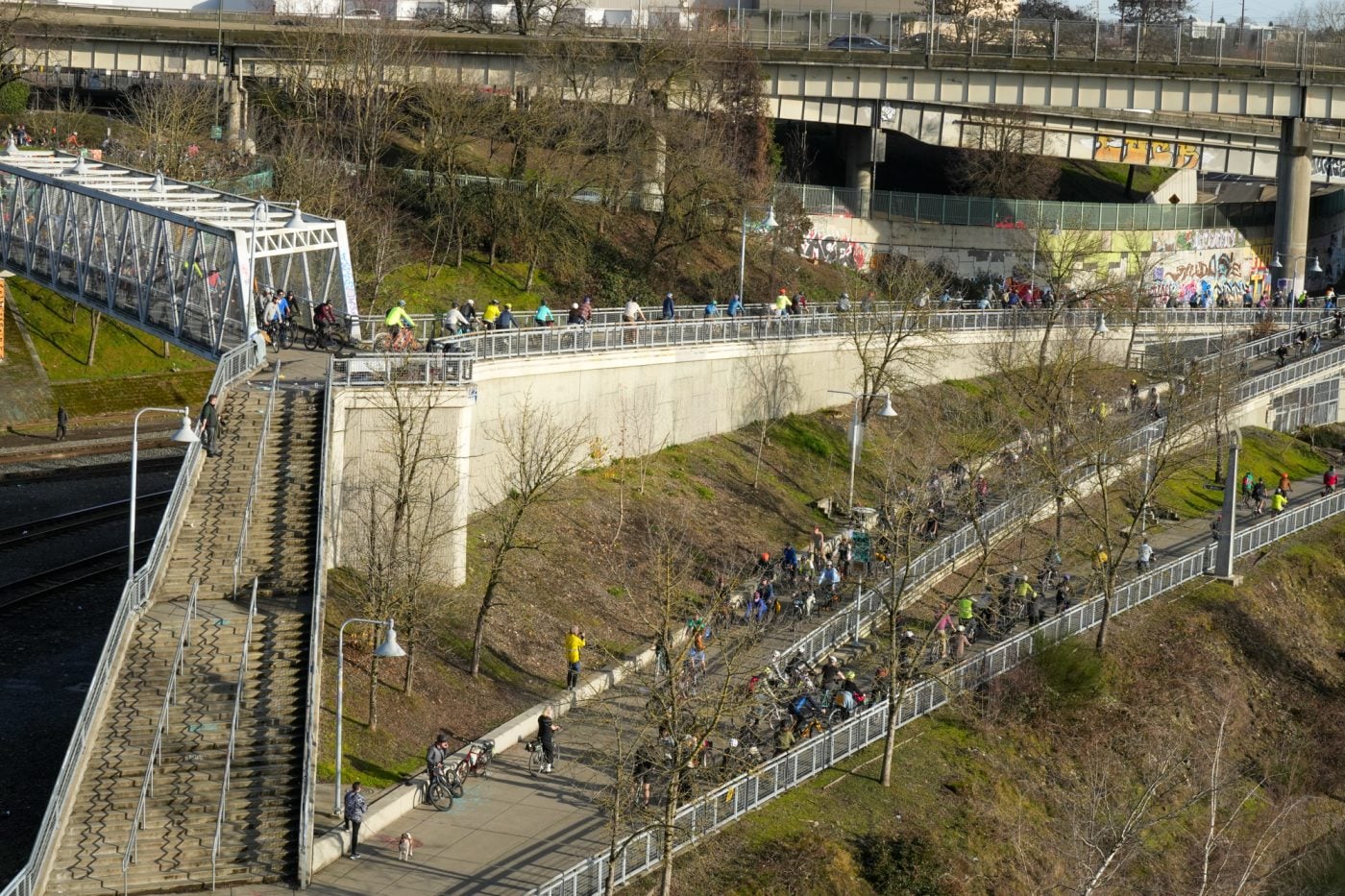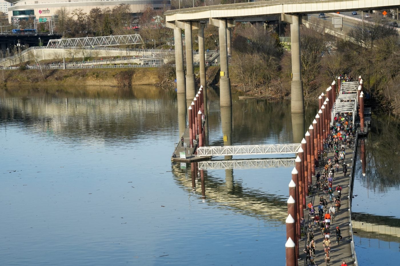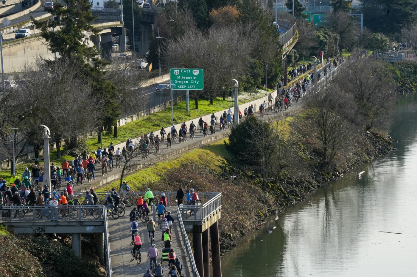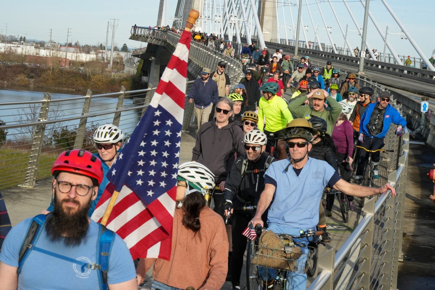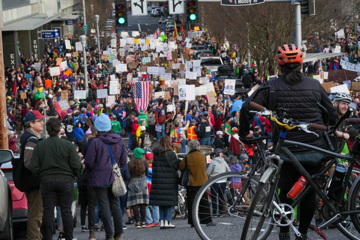 Thousands of people turned out on bikes to honor Alex Pretti and all victims of ICE and Trump’s fascist regime. At one point the line of people stretched from the Moda Center along the Eastbank Esplanade all the way to the Tillikum Bridge. The ride went from Irving Park to South Waterfront where a rally was being held.