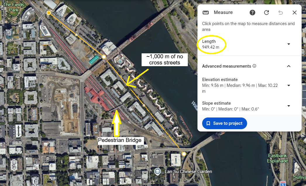 “Because the elevator has remained inoperable for years, mobility-impaired residents are effectively cut off from the Transit Mall and surrounding transit access. The bridge is the only practical pedestrian connection across the rail corridor. The stretch of NW Naito Parkway surrounding it, which contains more than 1,000 apartment and condominium units, has no cross streets for approximately 1,000 meters between the Steel Bridge ramp and NW 9th Avenue.”