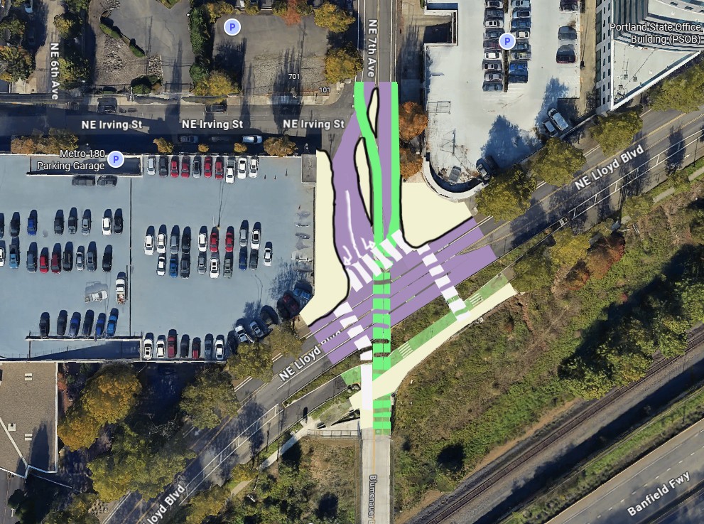 I can think of several reasons why this design would not pass muster, but the lane jog near the Irving intersection is a big issue here. The presence of multiple garage portals is likely why bi-directional auto access on 7th Ave was preserved. The only benefit is the slightly more direct path, but it’s very slight- the arrangement as built only requires ~10-30 more feet of travel as opposed to this example, which also introduces some funky sightlines/grades at the bridgehead. This treatment would still require a bike only phase as well.