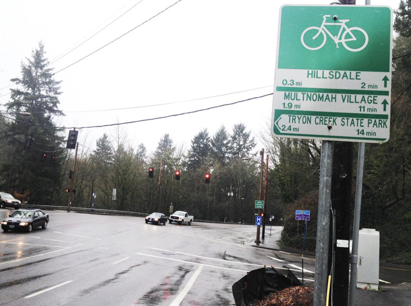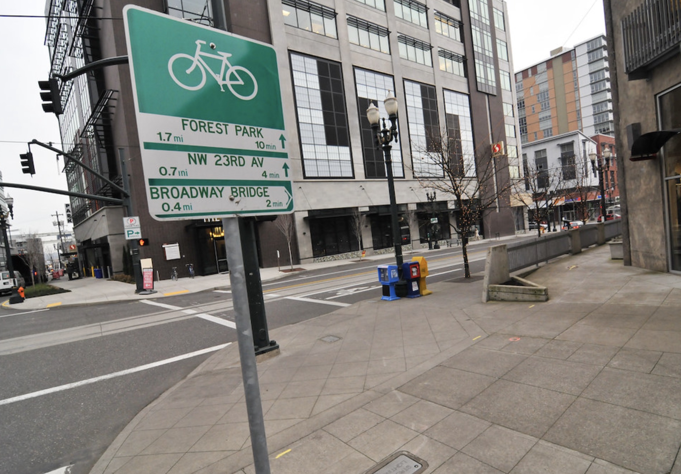 In February 2006, these green signs that give mileage and timing information about key destinations were a big deal. As per usual back then, Portland’s transportation bureau was a national leader in doing cool stuff for cyclists. Our guy with his hands on the bars back then, Roger Geller (who remains PBOT’s bike coordinator to this day), was big into pavement markings and network signage. His little, round bike markings with arrows were an early innovation that sprung up before we started putting shared-lane markings (called “sharrows”) on the ground.