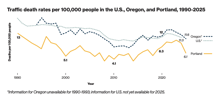 The downward trend in Portland mimics national trends. And while it’s too early to fully understand why, it’s likely that policies that make road safety a priority, combined with federal funding from the Biden Administration, and a return to pre-Covid behavior standards play a big role.