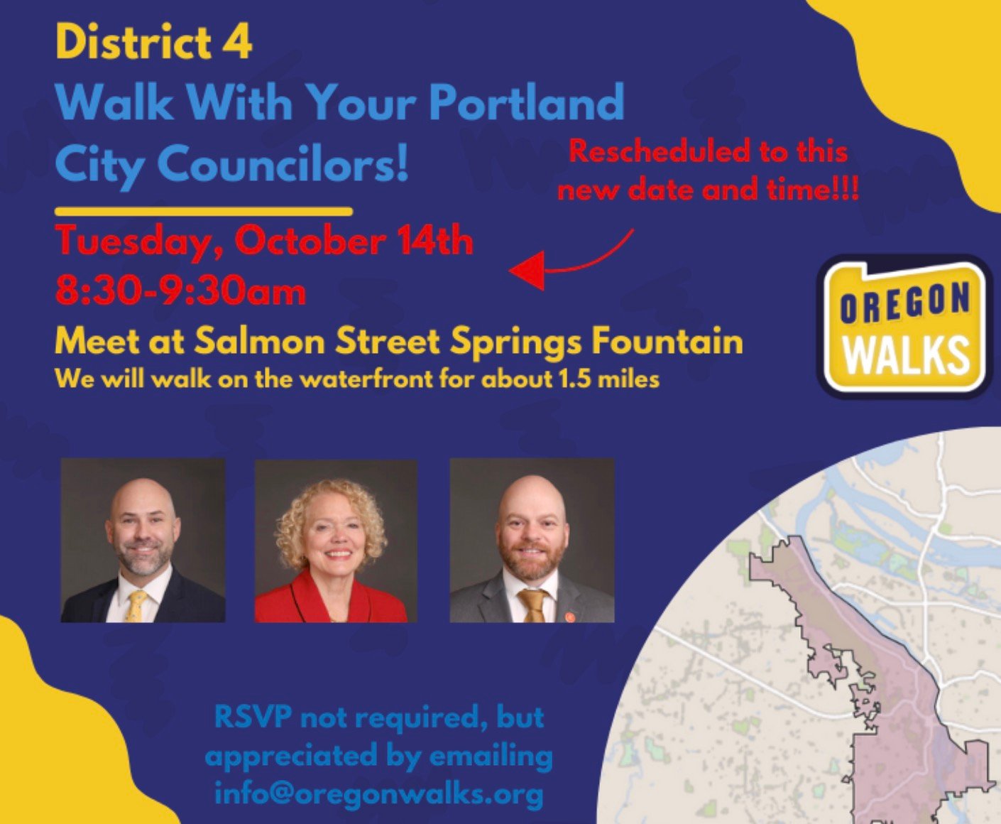 Take a short walk and talk with D4 Councilors Zimmerman, Clark and Green. Meet at Salmon Street Springs.